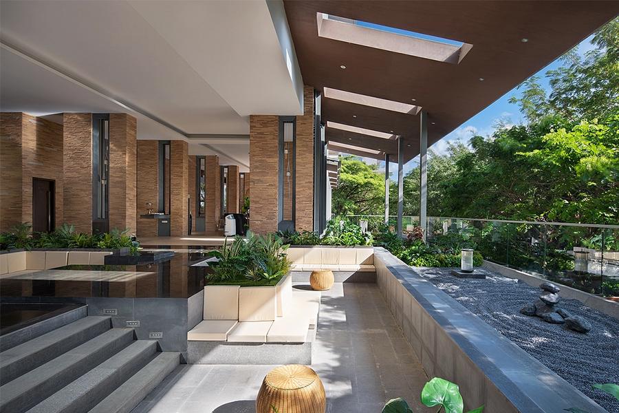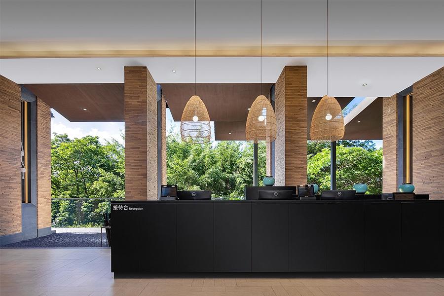 推开大门,大堂的景象率先撞入视野 —— 由天然石材堆叠而成的立柱,带着川西民居的质朴肌理,粗糙的石面仿佛还留着匠人手工雕琢的温度,却又因利落的现代线条切割,多了几分艺术装置般的先锋感。三盏藤编吊灯悬于空中,造型如林间成熟的果实,在黑色接待台上方投下柔和光晕,光影交错间,竟与远处落地窗框住的葱郁绿意形成了一场灵动的互动,建筑与自然的边界,在壹西格玛的设计巧思里变得模糊又温柔。