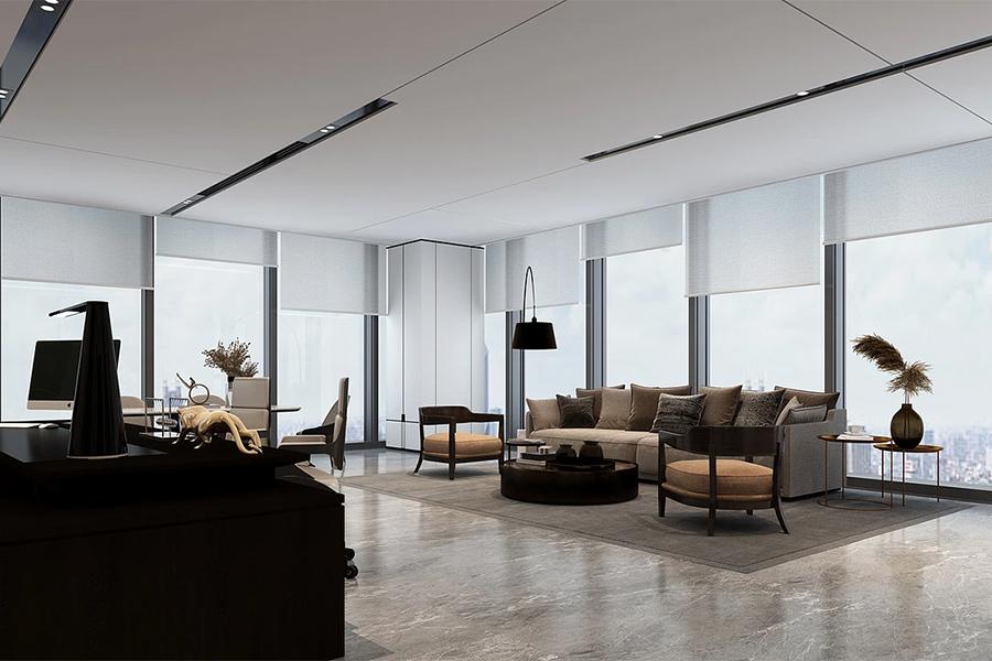 经理办公室的设计则尽显雅致格调。壹西格玛以原木家具的温润中和黑白配色的冷冽,黑色置物架简约大气,艺术装饰画的融入更提升了空间的艺术氛围。超大落地窗将成都科创城的公园景致引入室内,工作之余,满目绿意可消解疲惫,也为商务洽谈营造出轻松且不失格调的氛围。舒适的沙发区是思维碰撞的另一个场域,一杯清茶,一次深度交流,合作的契机往往就于此处悄然萌发。