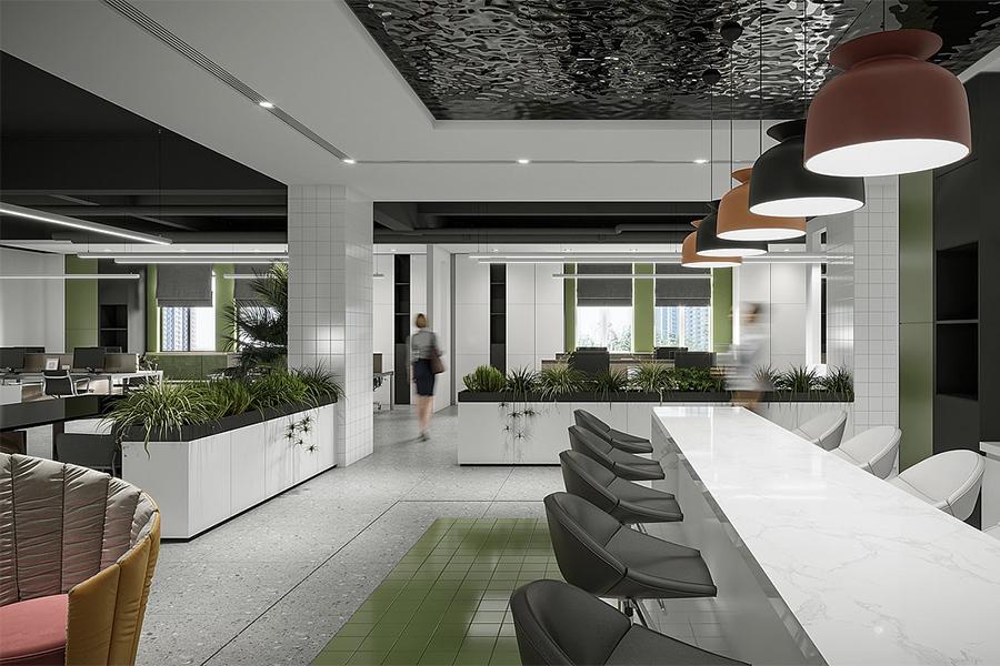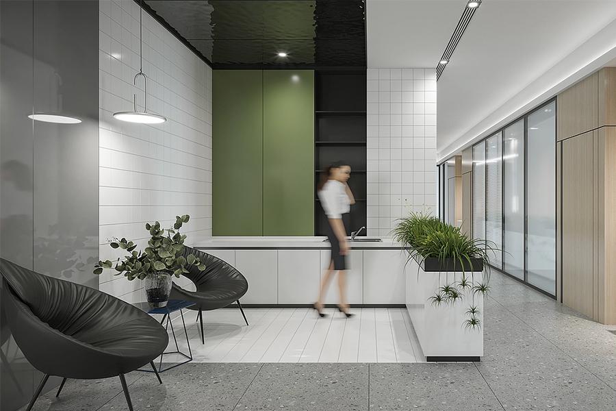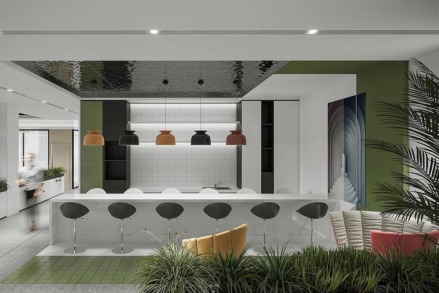 往深处走,休闲区是另一番天地。莫兰迪色的吊灯明灭间,橘红、墨黑、暖棕撞出活力,超长的白色吧台前,黑白灰座椅排成行,适合头脑风暴也适合放空片刻。地面的绿色瓷砖像把青羊的草坪搬了进来,四周的绿植疯长着生机,在这里工作从不是苦役,更像在都市绿洲里采摘灵感,这是四川壹西格玛对 “办公该有温度” 的理解,毕竟在青羊这片讲究生活质感的土地上,职场也该是享受的一部分。
