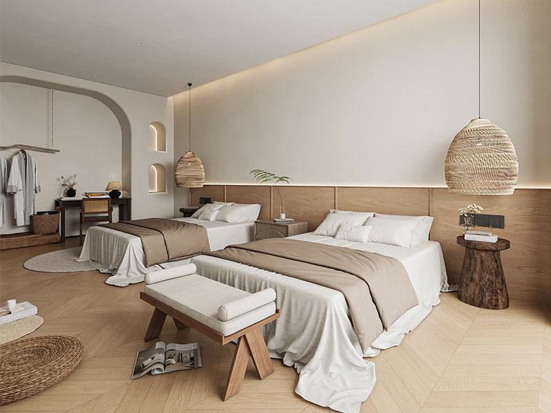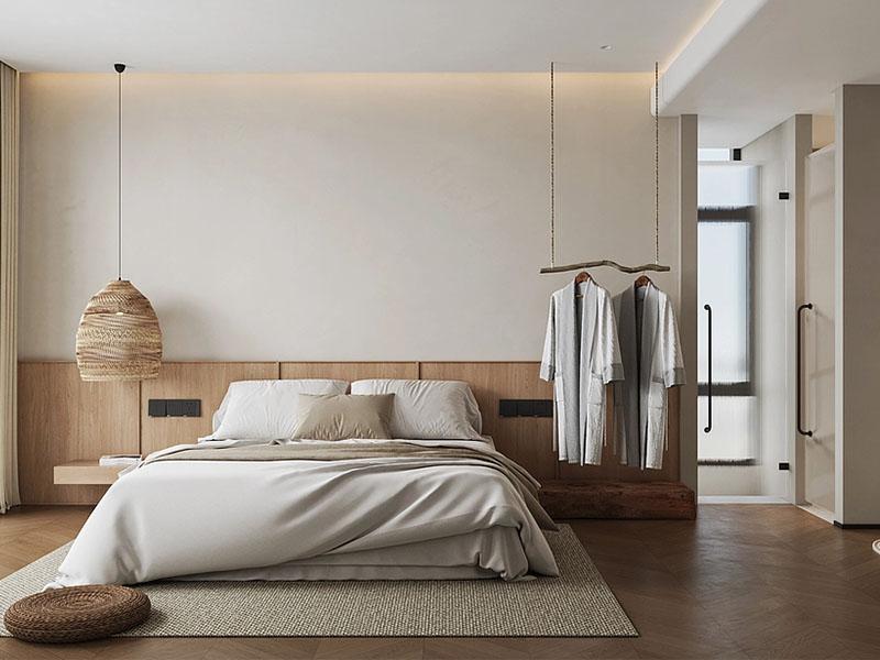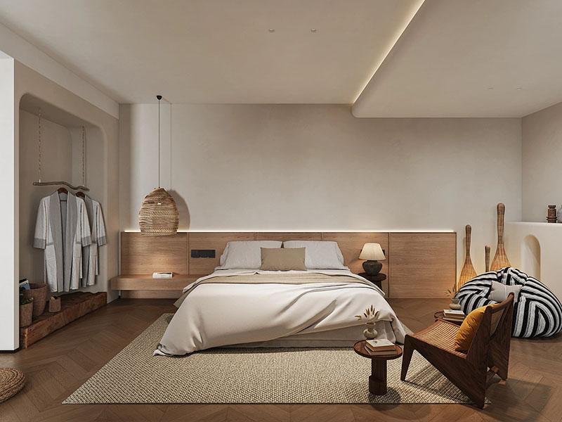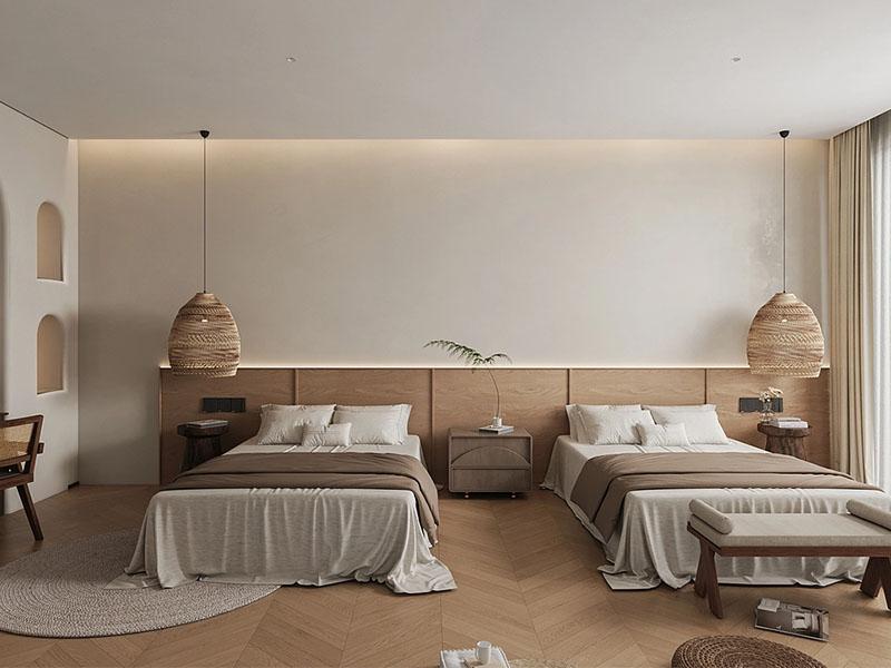 壹西格玛的现代中古风以大地色系为视觉基底,浅米白墙面、原木色家具、棕褐床品构成低饱和度暖色调,消解空间冰冷感,满足现代生活对松弛感的渴求。材质运用上,其将 “自然与手工感” 奉为核心,实木甄选橡木、胡桃木等,天然木纹成岁月印记;藤编与编织材质从吊灯到地毯广泛应用,棉麻布艺床品触感亲和,让复古成可触摸的生活质感。