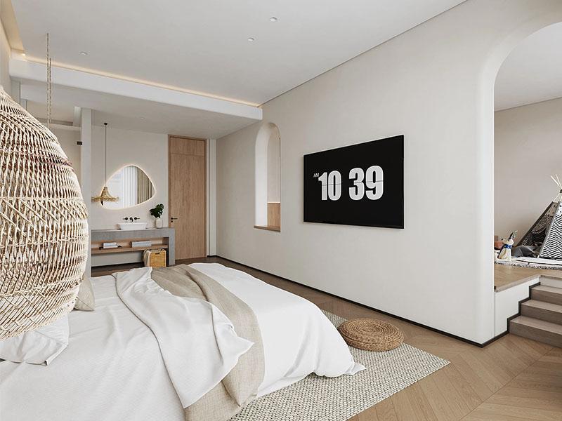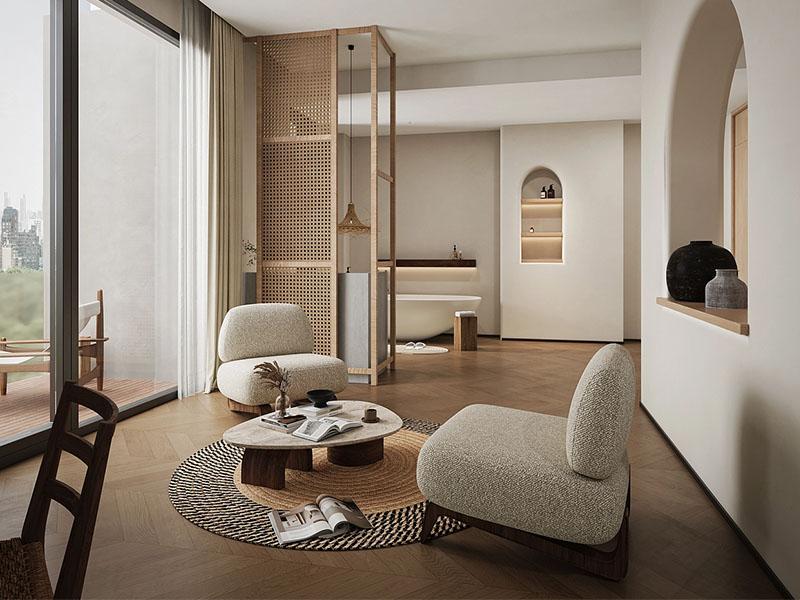空间布局上,壹西格玛秉持 “功能为骨,美学为魂”,卧室嵌入式收纳、卫浴木质格栅隔断,在满足实用性的同时,以拱形门洞、复古摆件实现 “实用” 与 “诗意” 共生。其用木质屏风、台阶划分功能区,保持通透感的同时丰富空间层次,是对 “当代生活方式” 的精准把握。