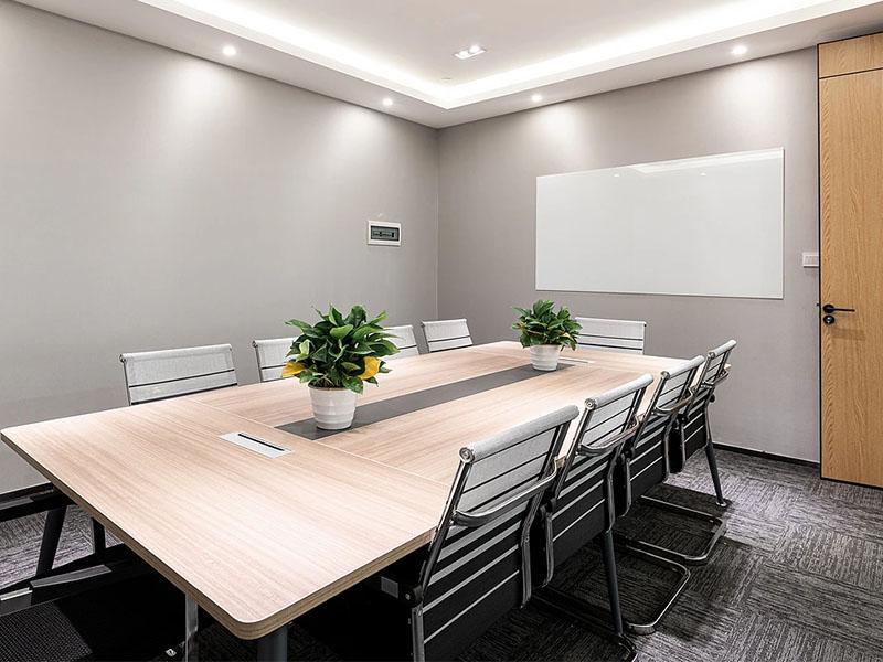功能分区的巧思让空间价值最大化。接待洽谈区以灰色皮质沙发、玻璃茶几构建沉稳专业的交流场域,旁边的玻璃隔断办公间(如经理室)在 “开放” 与 “私密” 间找到精妙平衡;独立办公区的一体化桌椅与储物柜设计,精准适配个人办公的储物与专注需求;会议室里的长形会议桌、大白板与柔和灯光,为团队协作搭建起高效的思维碰撞平台。