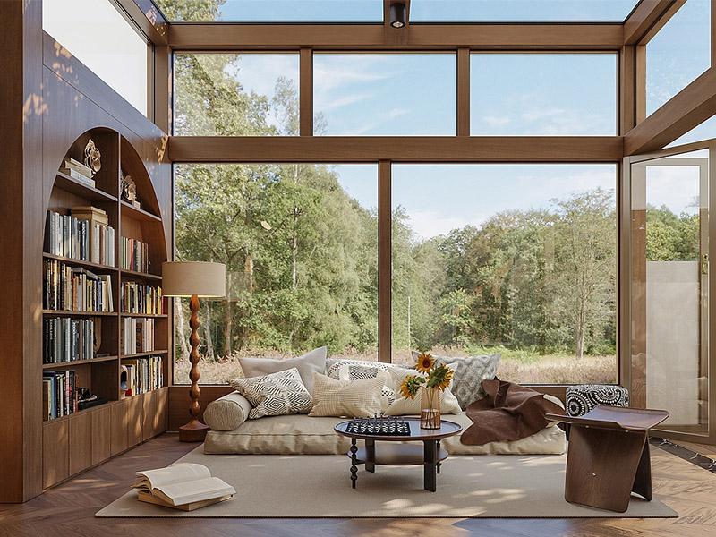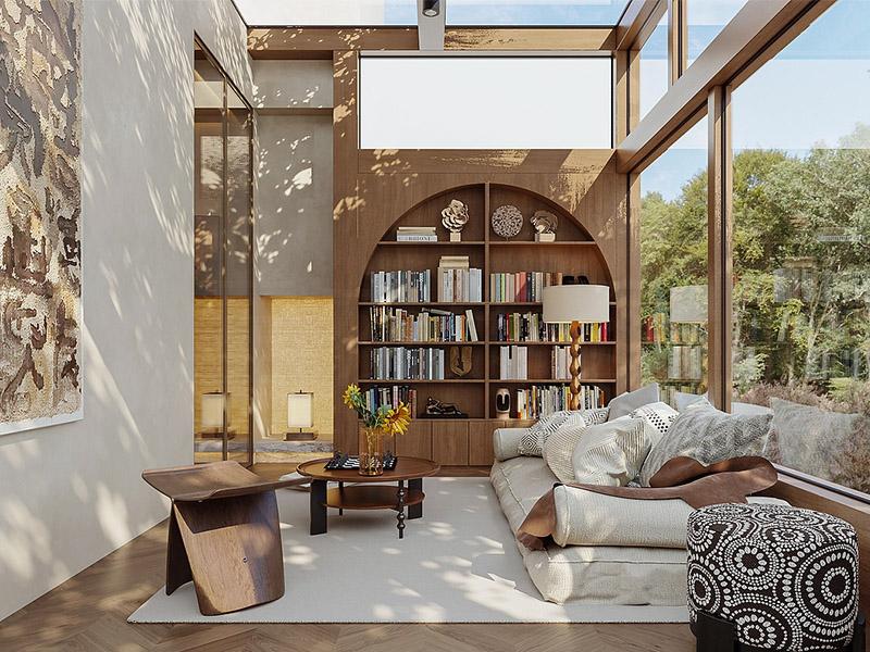 空间与自然的无界互动,是壹西格玛的设计灵魂。大面积落地窗与玻璃顶的运用,让客厅、阳光房彻底 “拥抱” 户外森林与天光。弧形木质书架上的书籍与摆件,棉麻沙发的松弛形态,让居住者在阅读、对弈时,随时能与自然光影共舞。这种 “把自然搬进家” 的巧思,在走廊区域也有体现 —— 深色石材地面延伸至木质格栅处,红色陶罐花艺成为视觉锚点,虚实之间,禅意层次悄然递进。