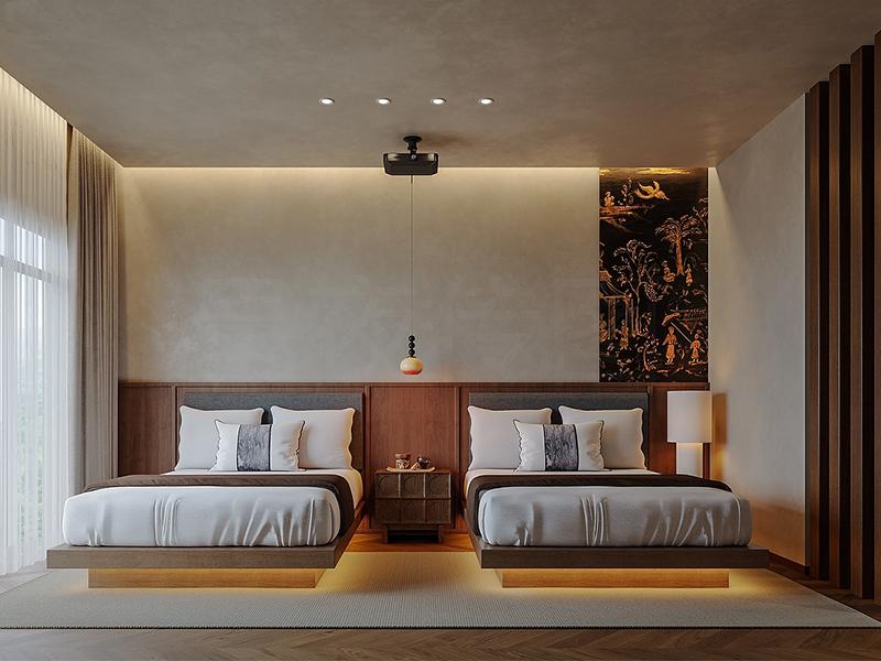 细节处的东方哲思,让壹西格玛的设计更具温度。餐饮区的几何开窗形成艺术化光影,极简吊灯与陶罐呼应着侘寂美学的 “不完美之美”;卧室里的东方纹样挂画、投影设备,在禅意基底上注入现代活力。从高端民宿的双栖休憩空间,到私人住宅的慢生活场域,壹西格玛始终在平衡:平衡材质的粗粝与精致,平衡空间的功能与精神,最终让每一处设计都成为 “回归自然、安顿内心” 的生活容器。