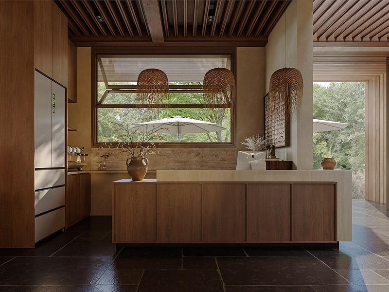 以原木、微水泥为核心材质,壹西格玛将大地色系的温暖质感铺满空间。卧室里,人字拼木地板与原木墙面的暖光交融,棉麻床品的柔软触感中和了木质的硬朗,双床布局或单床设计,都因内嵌灯体与艺术挂画的点缀,成为疗愈身心的私密场域。即便是功能型厨房,藤编吊灯与原木橱柜的搭配,也让操作区因可开启窗引入的绿意,成为兼具实用与美学的生活舞台。
