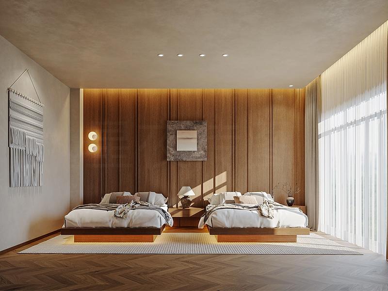 空间布局上,壹西格玛擅长在开放与私密间寻得精妙平衡。卧室与休闲区、卫浴区以玻璃砖隔断、弧形墙体等元素 “半开放” 分隔,既保留了空间的通透感,又悄然划分出功能边界。自然光可自由穿梭于各个区域,树叶的光影在墙面与家具上跳跃,让静态的空间有了动态的自然意趣。动线设计流畅自然,从起居到休憩再到卫浴,每一次移步都似在自然中漫游,消解了都市生活的局促感。