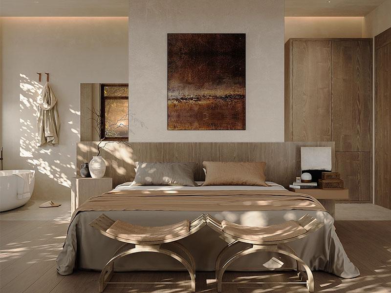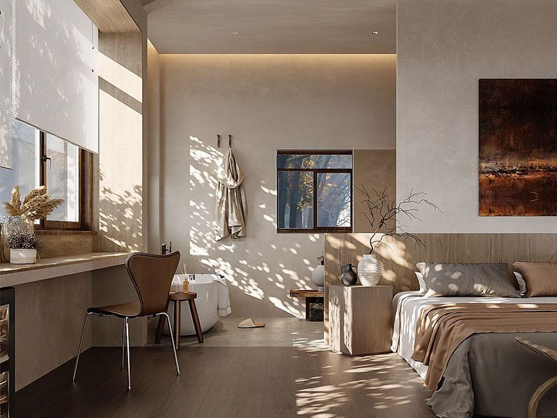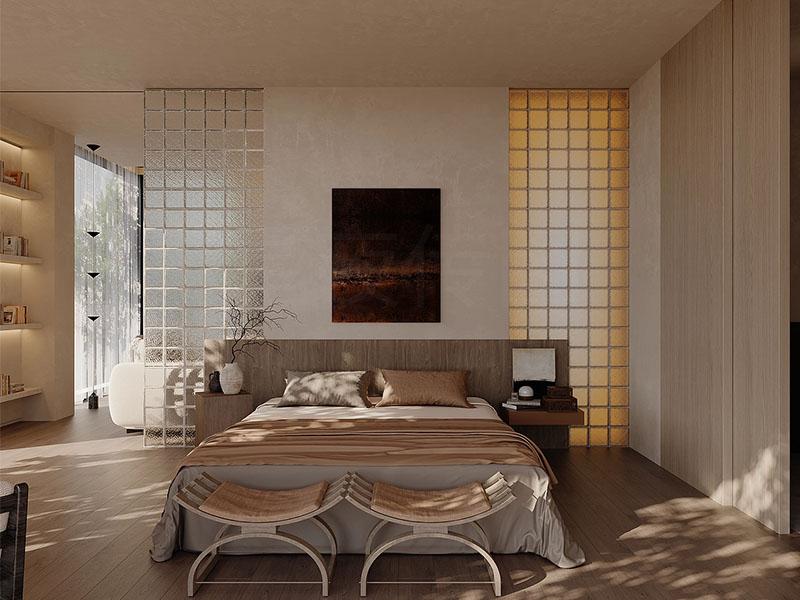 材质的层次营造是壹西格玛的拿手好戏。原木在空间中大量登场,床头板的粗犷纹理、地板的温润触感、家具的天然肌理,将自然的气息牢牢锁在居所里;微水泥或艺术漆打造的墙面,以粗糙质感呼应侘寂内核;玻璃砖隔断既分隔空间,又让光线温柔渗透,成为功能性与美学性的绝佳统一。软装搭配同样用心,棉麻家具的松弛感、做旧装饰画的艺术感、枯枝花艺的禅意感,每一件单品都与硬装材质形成对话,共同构建出层次丰富的质感宇宙。