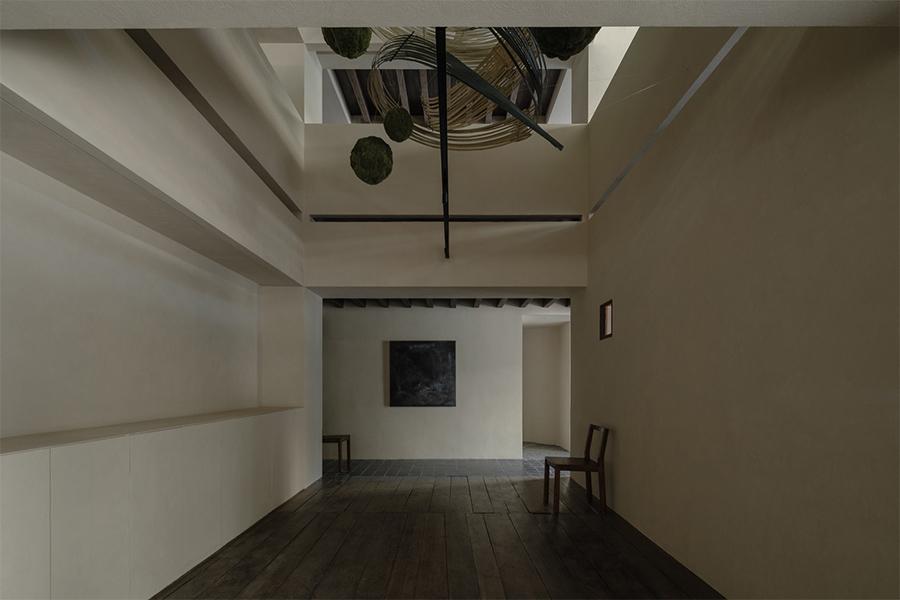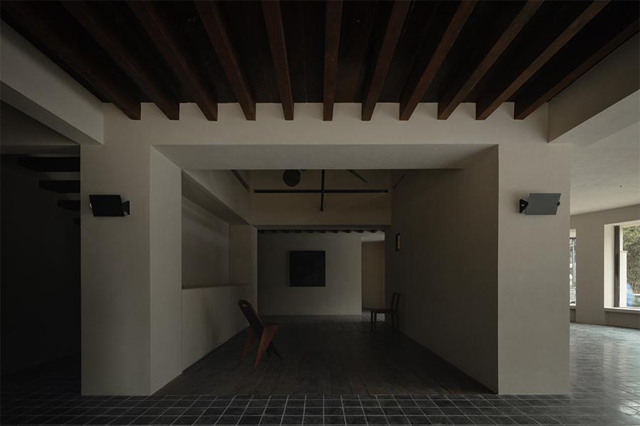 奶杏色的微水泥墙面带着细腻的肌理,像被春日阳光晒软的棉花,顺着空间的走势铺展成温柔的底色;脚下的哑光黑砖沉静得像深夜的巷弄,与墙面的柔糯感轻轻碰撞,又衬得一旁深胡桃木楼梯愈发温吞 —— 每一级台阶都浸着岁月打磨后的质感,踩上去的声响轻得像一声叹息。抬头看,裸露的深色木梁顶未做任何修饰,粗粝的纹理里藏着老成都巷弄的烟火气,却与墙面的软意拧出奇妙的平衡,像是四川壹西格玛特意保留的生活褶皱,让空间少了冷硬的距离感。