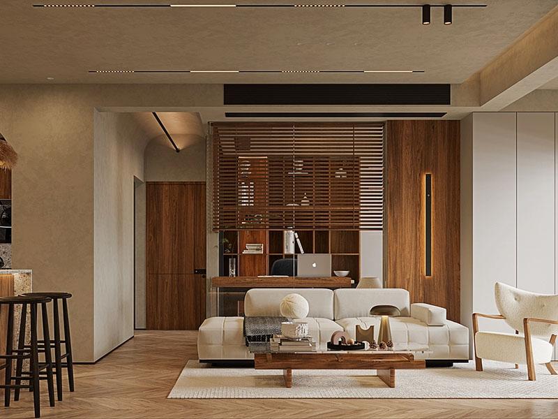 空间设计上,壹西格玛打破功能分区的刻板界限,采用半开放布局实现空间的通透与互动。客厅与书房以玻璃隔断、木质百叶衔接,既保证了各自的功能独立性,又让光线自由穿梭,让两个空间形成视觉上的呼应与延伸。客厅的模块化沙发线条简约却不失设计感,搭配柔软的针织抱枕,为日常休憩提供舒适载体;书房的实木书桌纹理自然,搭配人体工学椅,在满足办公学习需求的同时,融入整体美学氛围,让实用与雅致完美平衡。