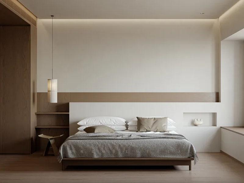 卧室区域是壹西格玛营造温馨感的核心阵地,大量胡桃木材质的运用成为点睛之笔 —— 床头板、定制书柜与地板形成统一的木色体系,自然纹理传递出质朴温润的气息,与米白、浅灰的墙面、软装形成柔和对比。细节处更见匠心:床头背景墙暗藏灯带,在夜间散发柔和光线,既避免了强光刺眼,又为空间增添了层次感;格子书柜兼具收纳与展示功能,内嵌灯带让陈列的书籍、摆件更具氛围感;地板采用人字拼铺法,在简约空间中注入精致细节,让平凡的地面成为空间的隐性装饰。