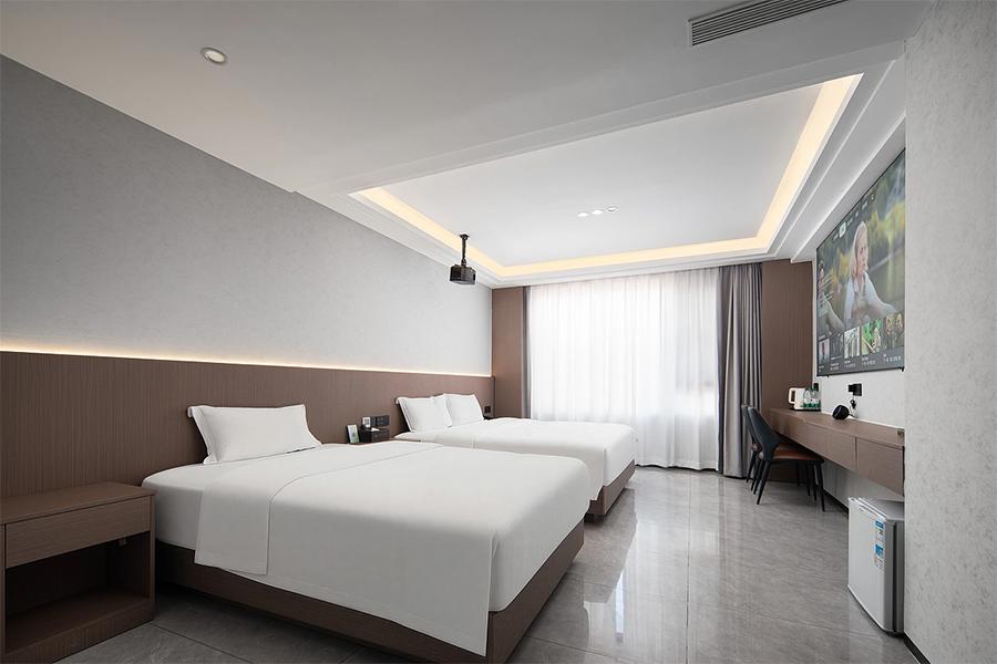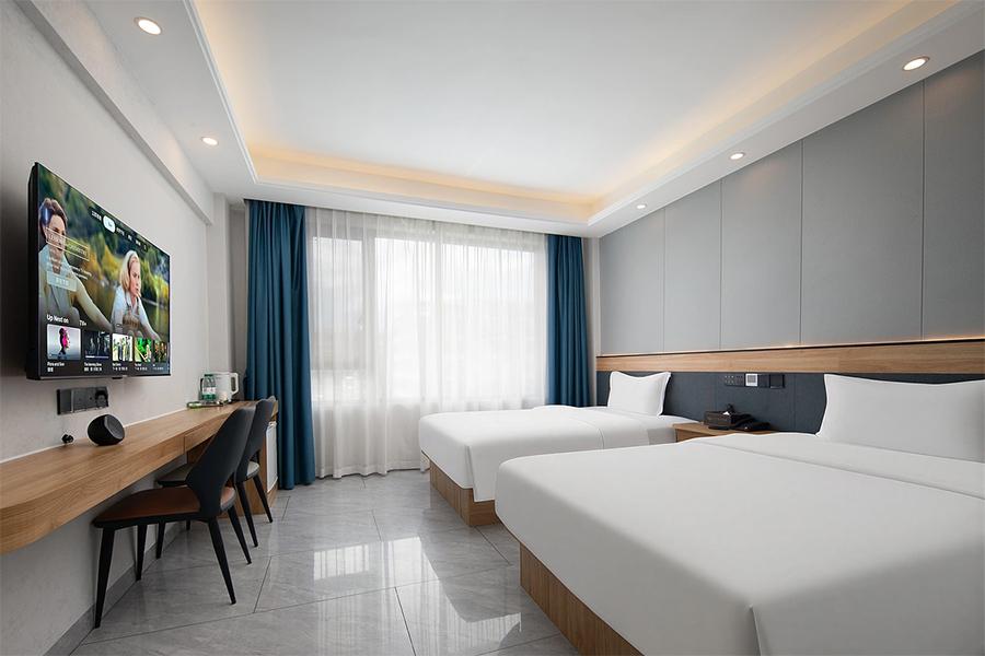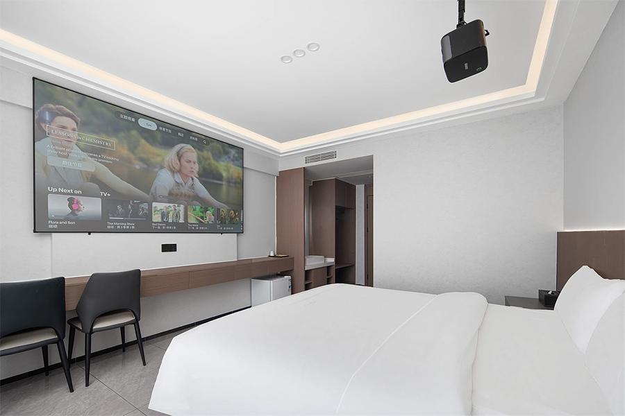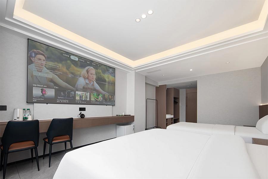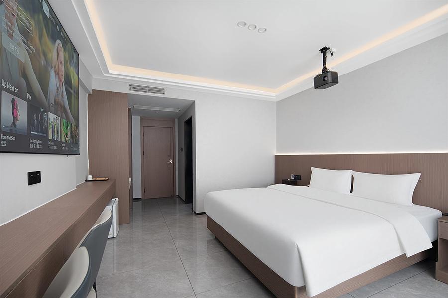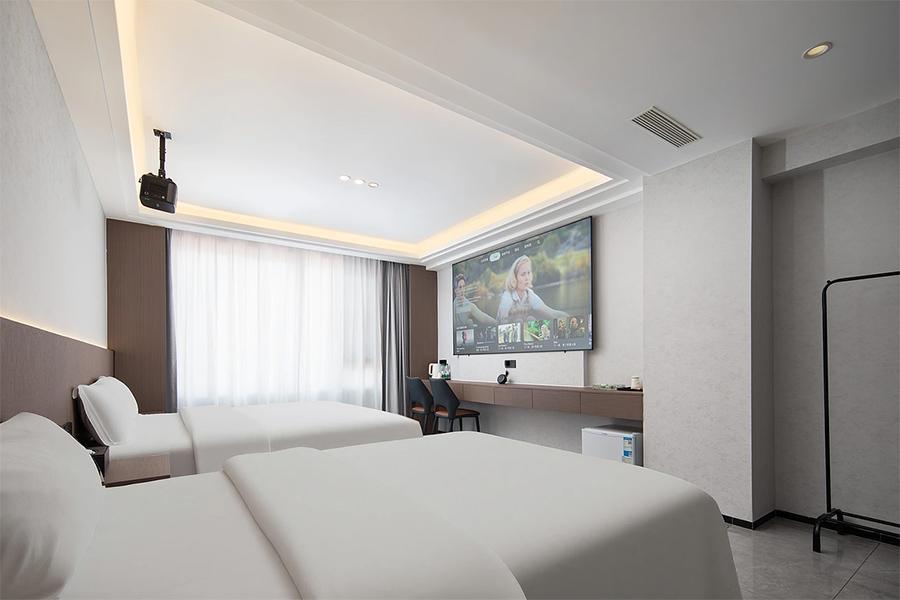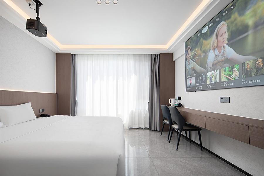 美学之下,是对功能场景的深度重构。客房“影音沉浸区”堪称点睛之笔,吊顶投影与超大幕布构建私人影院,团队反复调试安装角度与墙面反光率,确保白天观影清晰,线路则全隐藏处理;书桌区采用一体化长桌搭配人体工学椅,嵌入式抽屉与侧边柜体收纳随身物品及迷你电器,兼顾办公与休闲;睡眠区床间距超1.2米保障隐私,床头带USB插座与可调节开关,高弹性床垫搭配高支棉床品,隔绝喧嚣的遮光窗帘,全方位营造深度睡眠环境。公共区域同样用心,挑高大堂配简约艺术装置,模块化休息沙发灵活适配人流,走廊嵌入式壁灯与导视灯带营造静谧氛围。