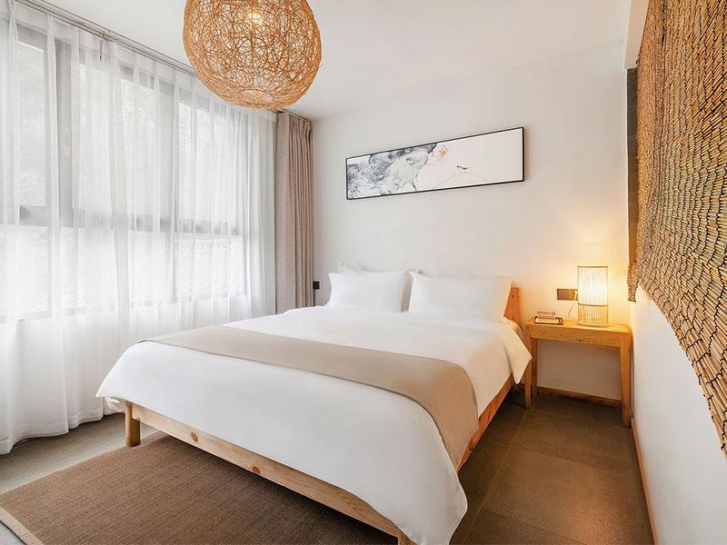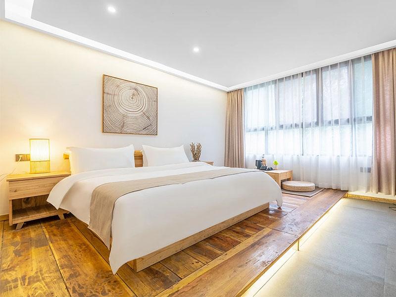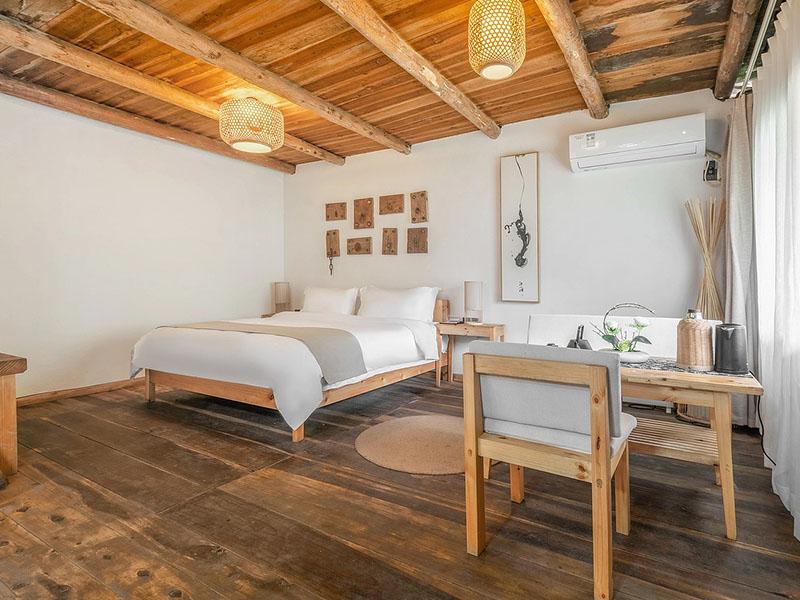 设计中的细节巧思更让空间焕发生机与叙事感:部分房间保留了原木屋顶的自然弧度与原生纹理,裸露的木梁勾勒出质朴随性的轮廓;墙面点缀的水墨装饰画、悬挂的复古船桨,或是角落摆放的绿植盆栽,既不破坏整体的简约基调,又为空间增添了独特的艺术气息与故事感,避免了素色设计可能带来的单调感。