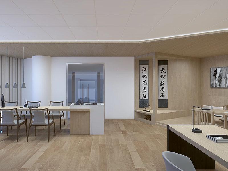 书法卷轴悬于格栅隔断旁,笔墨间的舒展意趣与木质格栅的光影交错相融,既保留了传统空间的 “漏景” 韵味,又用现代材质的轻盈感平衡了中式元素的厚重。工位以矮屏风划分出 “小聚落”,明式线条的茶桌嵌于开放区,开会时围坐于此,方案讨论都多了几分 “文房对谈” 的松弛;独立办公室里,水墨纹理的隔断与简约办公家具相衬,科技设备隐于留白处,“效率” 与 “禅意” 在此达成默契,敲键盘的节奏都跟着空间的舒展慢了半拍。