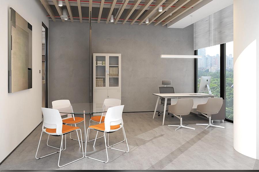 相邻的小型洽谈区则是另一番松弛感:玻璃圆桌搭配橙白撞色的座椅,轻盈的线条让沟通更无压力;一旁的书柜与办公区相连,随手可取的资料让临时交流也能高效落地。而这处空间的妙处,在于壹西格玛并未将 “办公” 与 “休闲” 割裂 —— 当员工需要短暂的头脑风暴,或是客户需要轻松的初步沟通,这里便是恰到好处的场域。
