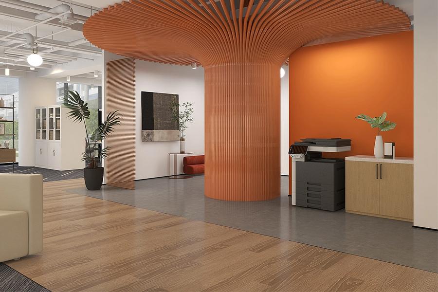 推开玻璃门,弧形木纹吊顶如舒展的羽翼铺展而来,暖橙色的格栅肌理在光影里晕开柔和的张力 —— 这是空间给人的第一重问候。墙面的发光品牌标识简洁醒目,与一旁的艺术装置呼应,既锚定了企业的视觉记忆点,又以现代设计语言消解了商务空间的疏离感。地面的水泥灰与木纹材质自然过渡,悄然划分出动线与驻留区,而几株舒展的绿植则为硬朗的空间注入了自然的呼吸感;壹西格玛的设计巧思,从踏入空间的第一秒便已显现。