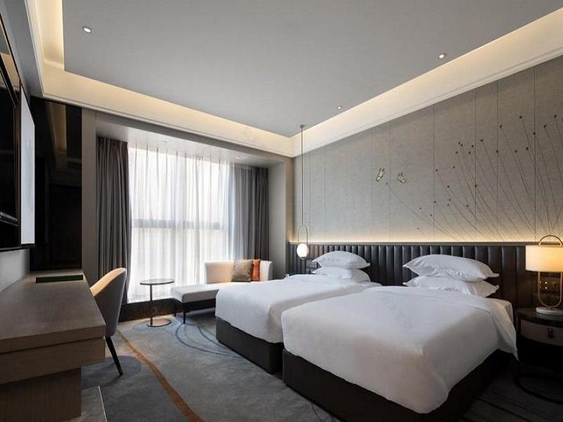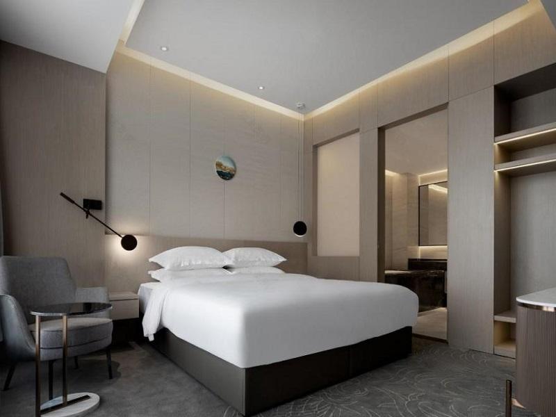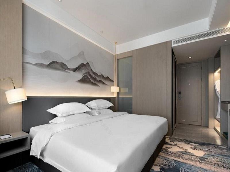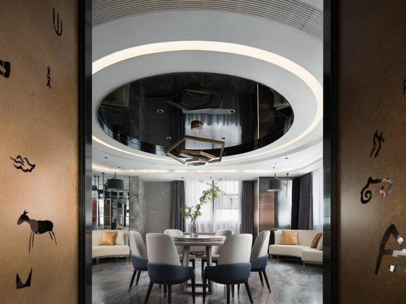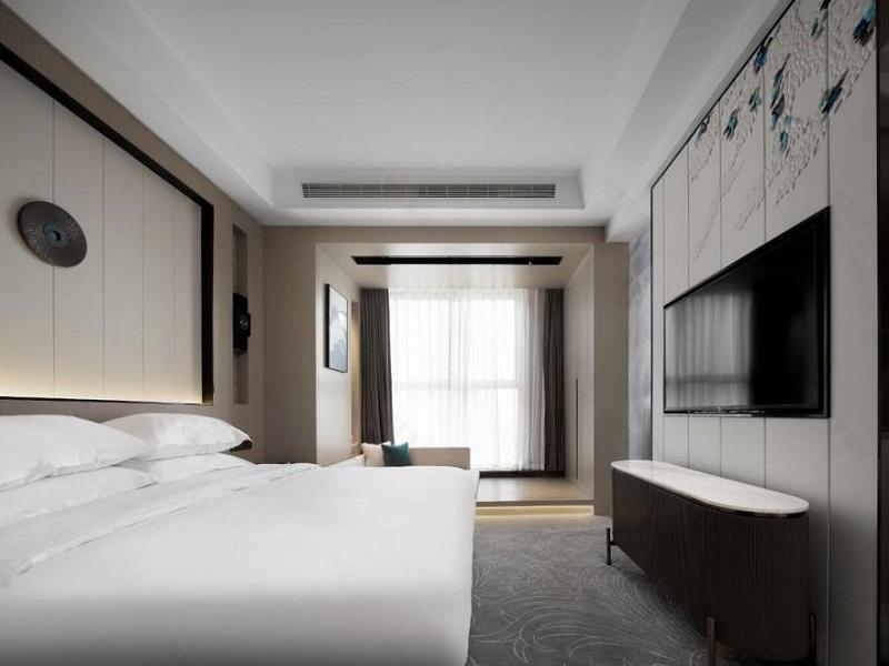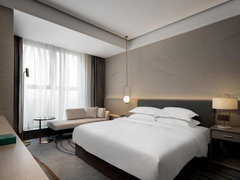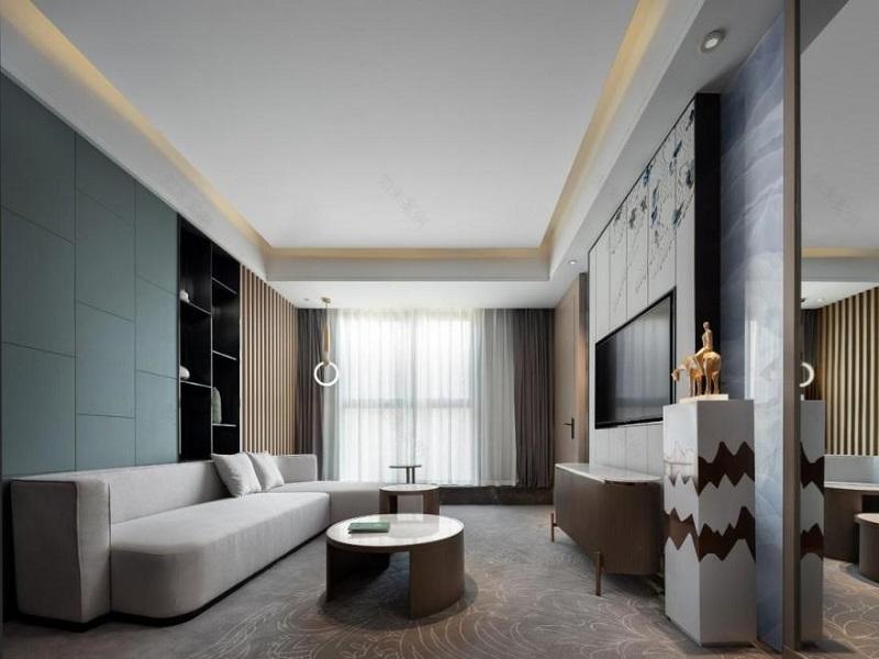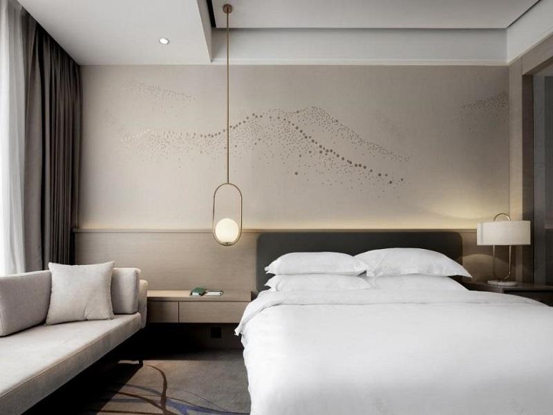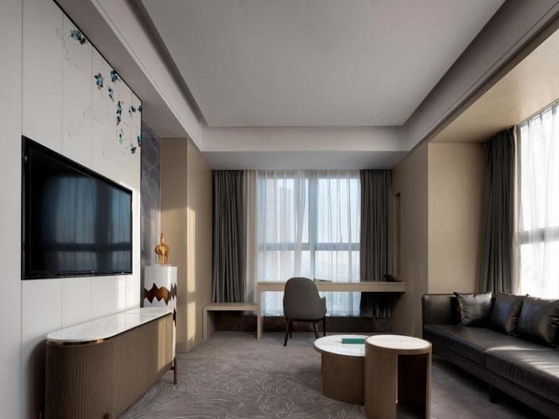 穿过艺术过廊进入酒店大堂,挑空的空间让人豁然开朗。墙面上若隐若现 的山形则是通过提取伏羲远山山脊而来,与陈设台上的山形雕塑形成呼应,一 虚一实。轻盈的艺术吊灯,接待台后的透光铜板随意中带着规则犹如甲骨文的 笔画组合而来。