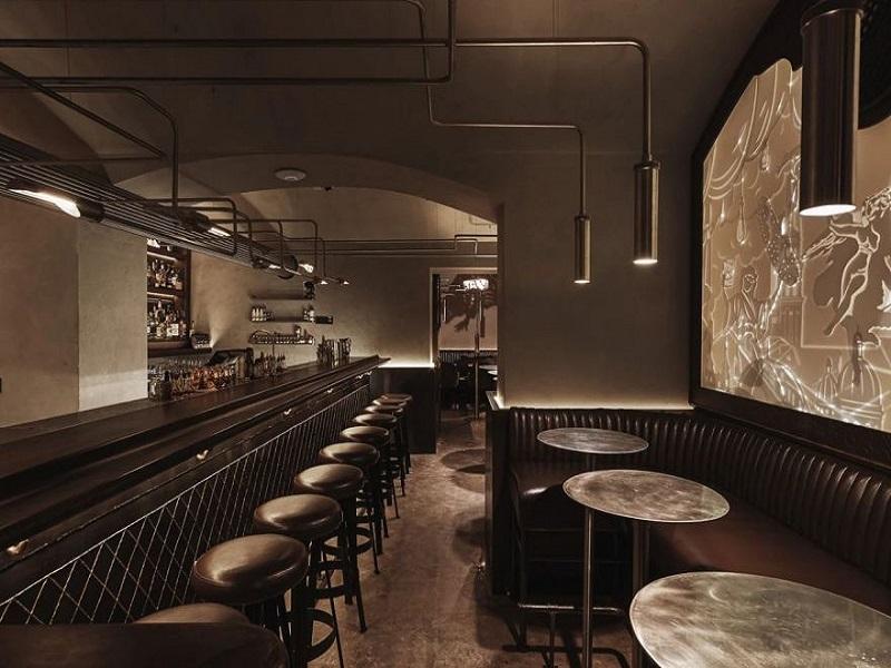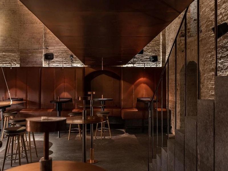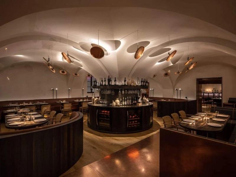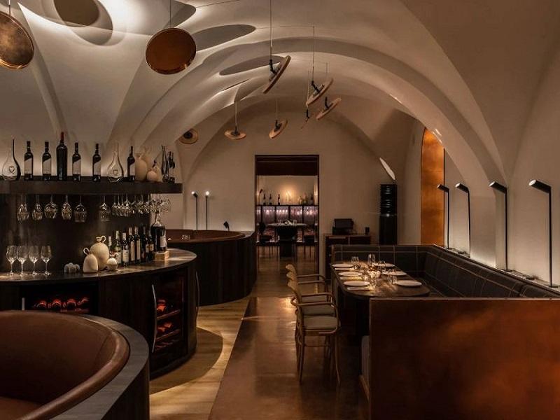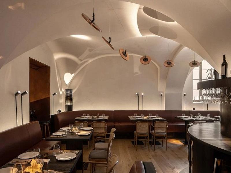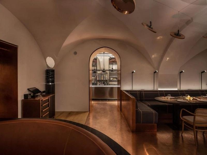 该餐厅有5个大厅,约有120个座位。餐厅内部有很多铜元素,它强调了这个地方的贵族气息,除了内部的铜之外,你还可以看到实心的橡木,皮革和钢。木材是内部的主要材料,自然光通过阁楼窗户进入室内。餐厅的大部分厨房元素都是开放的