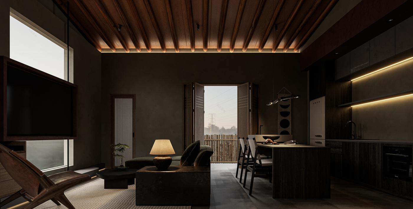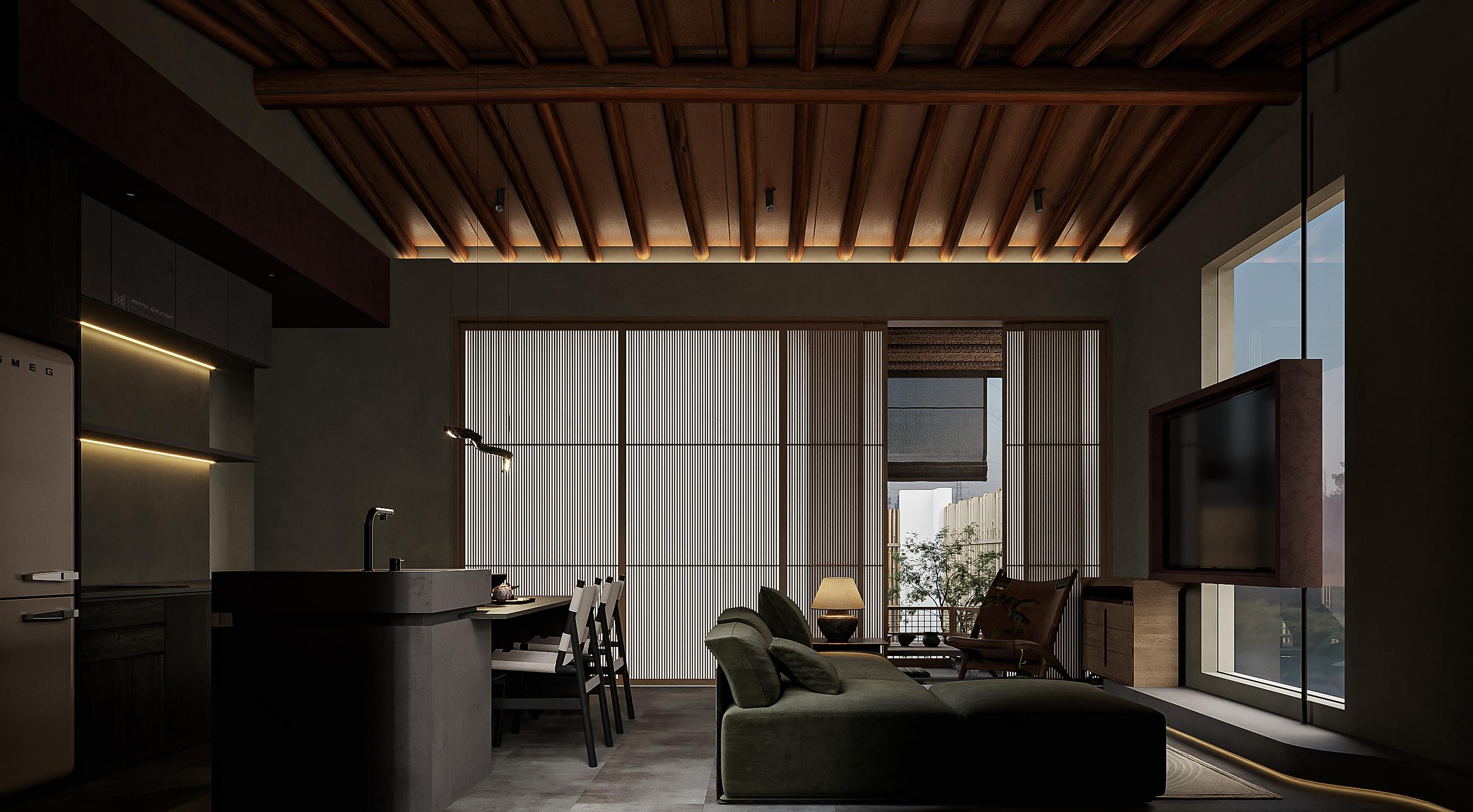 民宿酒店装修设计旨在打造一个独特而舒适的居住体验。整体风格采用简约复古冷色系,营造出一种宁静、高雅的氛围。