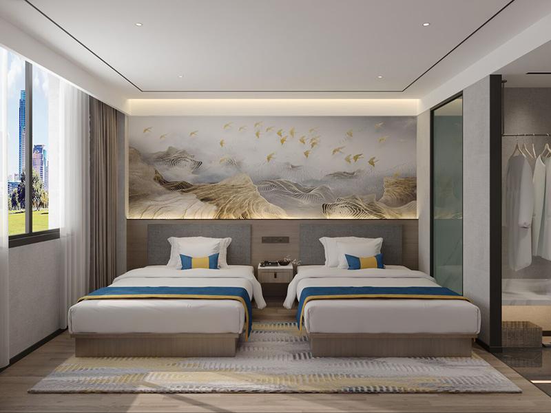 客房部分,墙面以亮灰色为主,搭配深浅不一的灰色家具,营造出宁静的休息氛围。床头的背景墙采用抽象艺术画作,为房间增添了一抹艺术气息。窗帘选用遮光面料,确保了客房的私密性和良好的睡眠环境。