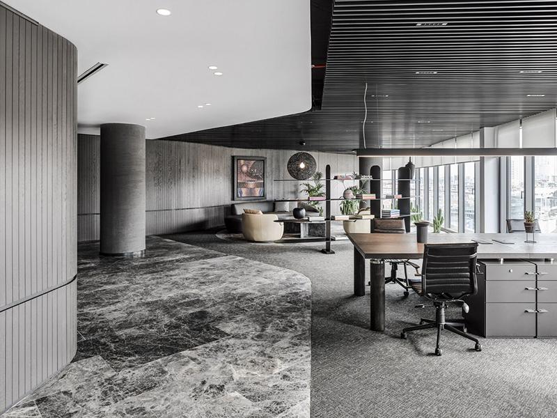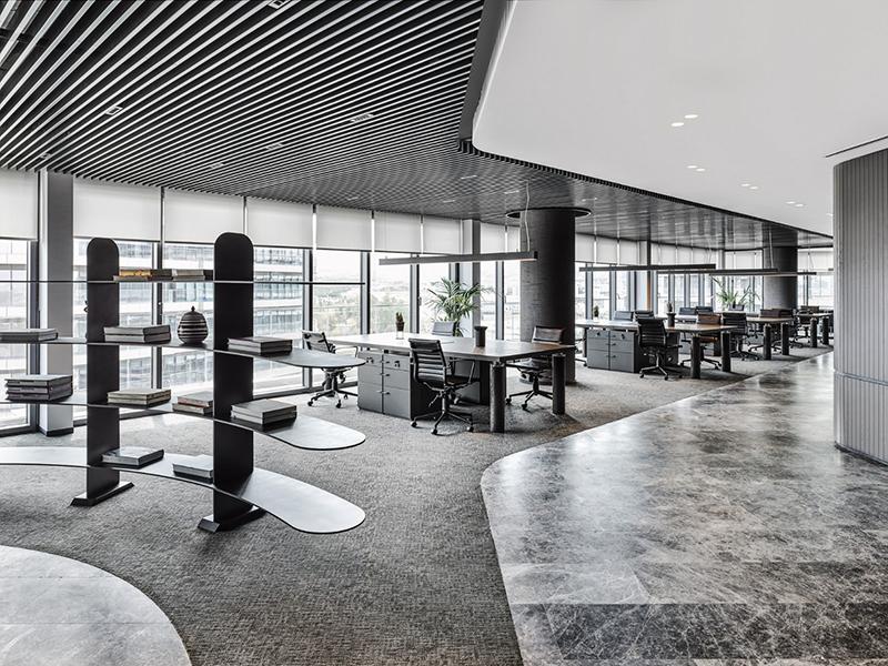 办公区域的设计同样延续了灰白黑的色调,灰色的工作台搭配白色的办公椅,简洁大方。黑色的隔断墙不仅划分了不同功能区,还起到了装饰作用,使得空间更具层次感。为严肃的办公氛围增添了一丝活力。