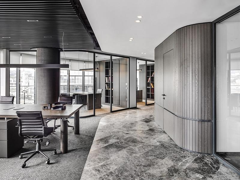 成都成华区办公室装修改造,展现了一种现代办公室空间的新境界,整体以灰、白、黑三色调为主,打造出一个高端大气的办公环境。
