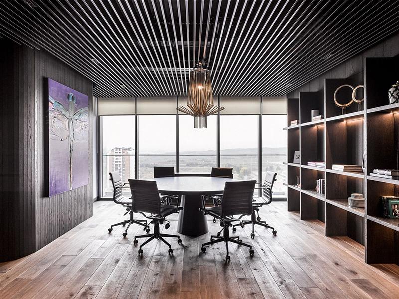 会议室的设计更是高端大气,灰白色的墙面与黑色会议桌形成鲜明对比,营造出专业且高效的会议环境。LED线性灯光的巧妙运用,既保证了照明需求,又提升了空间的现代感。
