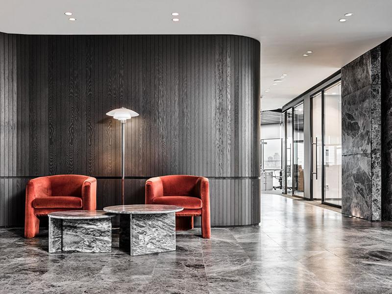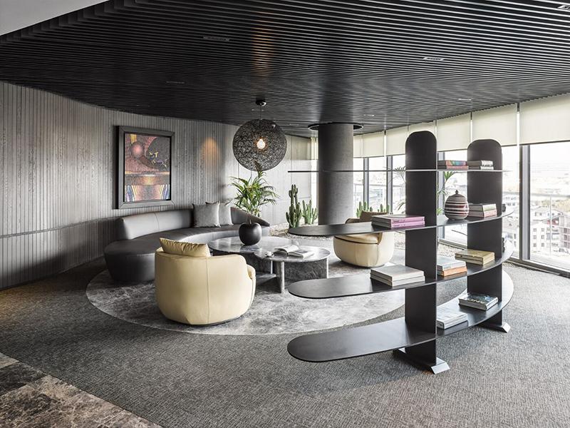 休闲区则是一个充满人性化的空间,灰色沙发、白色茶几与黑色背景墙相得益彰,营造出轻松舒适的氛围。在这里,员工可以暂时放下工作压力,享受片刻的宁静。