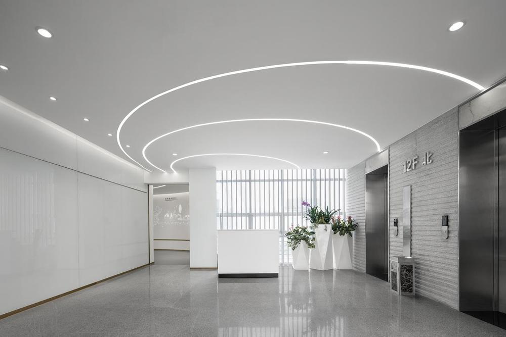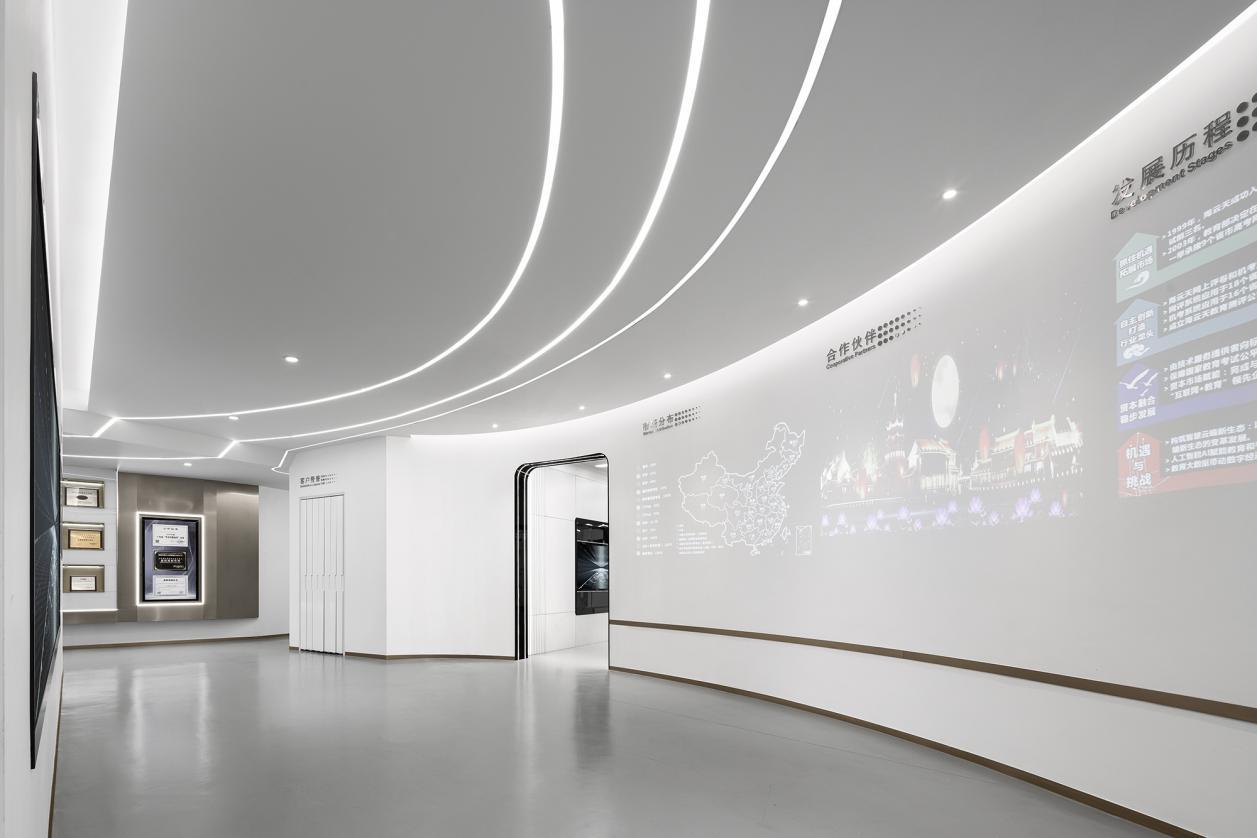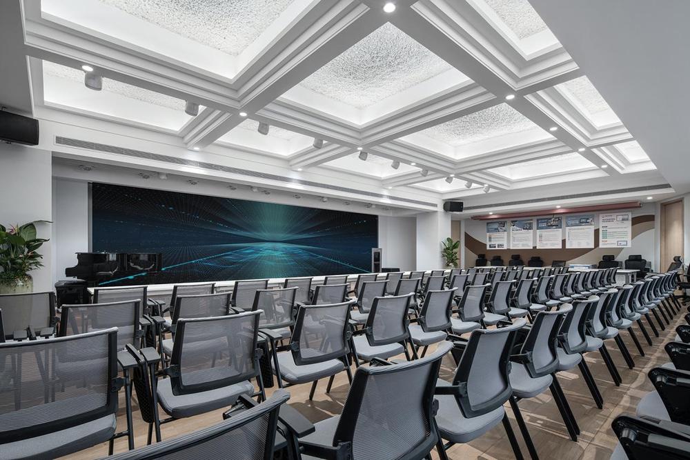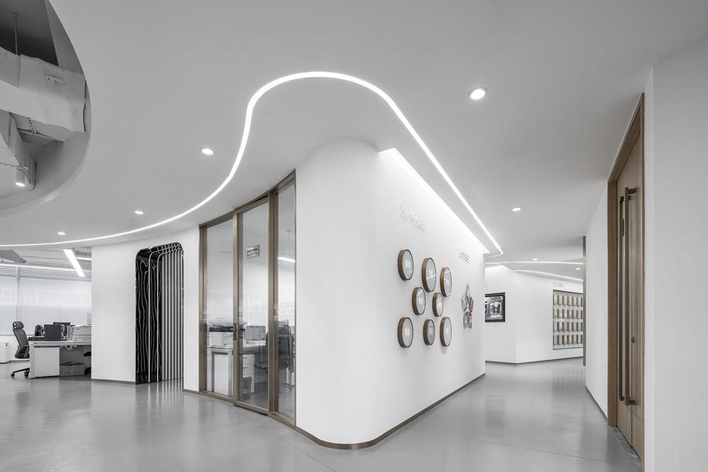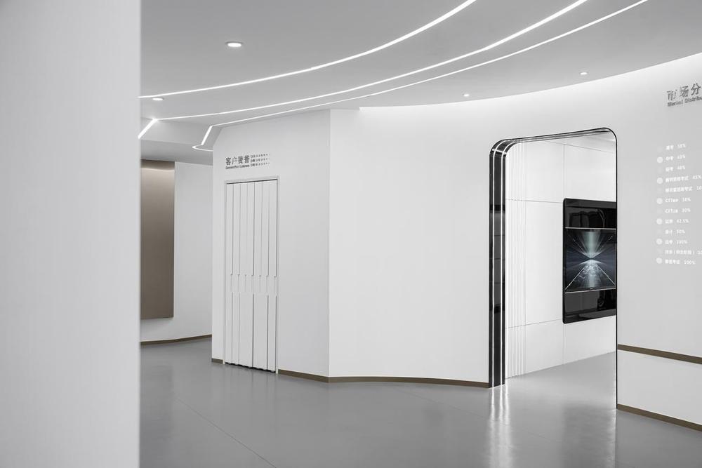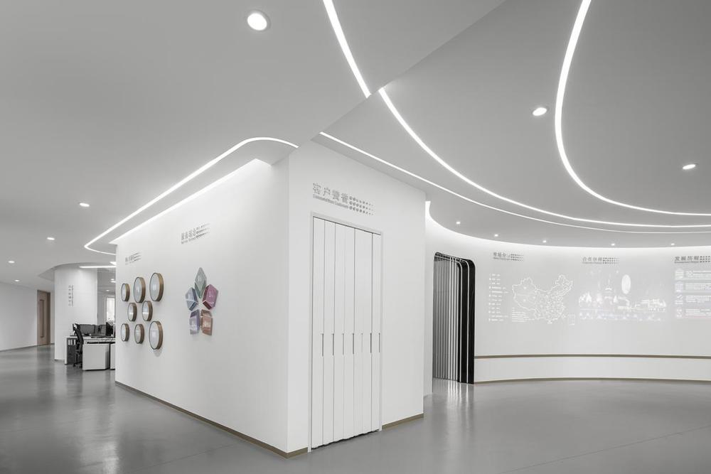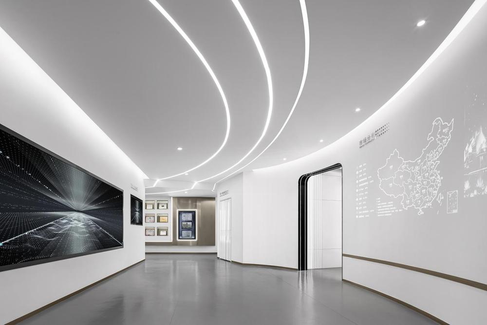 当访客踏入这个办公空间时,首先会被那充满科技感的硅胶灯带所吸引。灯带如同一道流动的光线,牵引着访客的视线,缓缓地展开这个充满未来感的空间界面。在这个过程中,一个极具未来感的精神场域逐渐呈现在访客眼前。整个展示厅仿佛是一幅宏伟的画卷,将海云天的宏大蓝图和美好憧憬展现得淋漓尽致,给访客带来了极为深刻的首要记忆点。