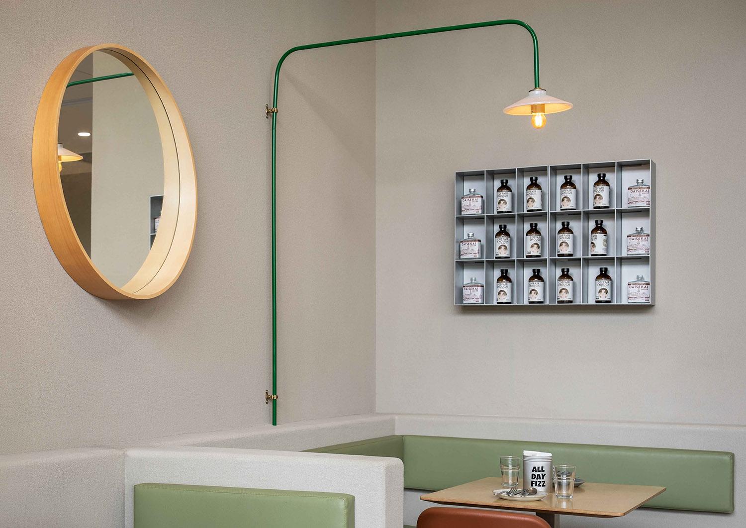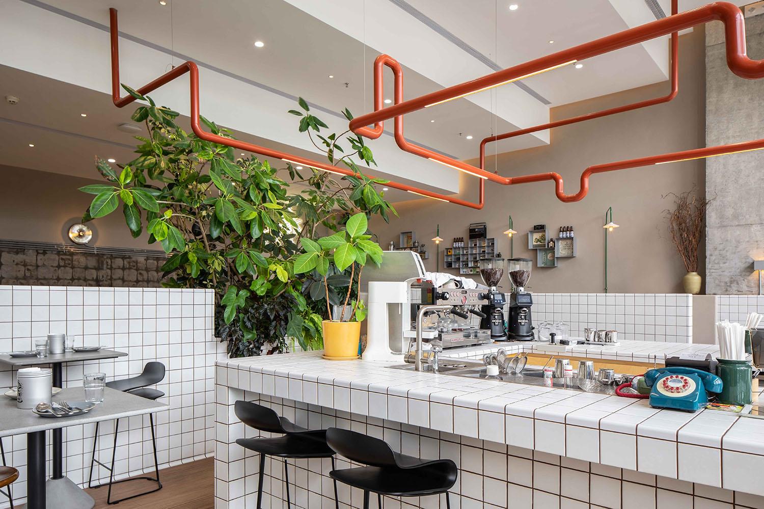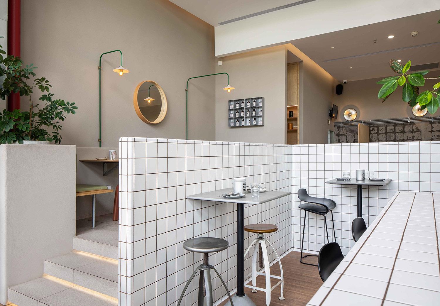 材质的巧妙搭配构建起空间质感。白色小方瓷砖复古又现代,大面积用于吧台与隔断,易于清洁且极具风格辨识度;木材的温暖与金属的硬朗碰撞,木质桌椅、圆形木框镜子散发自然亲和力,金属椅腿、吧台设备展现工业精致,二者相辅相成。