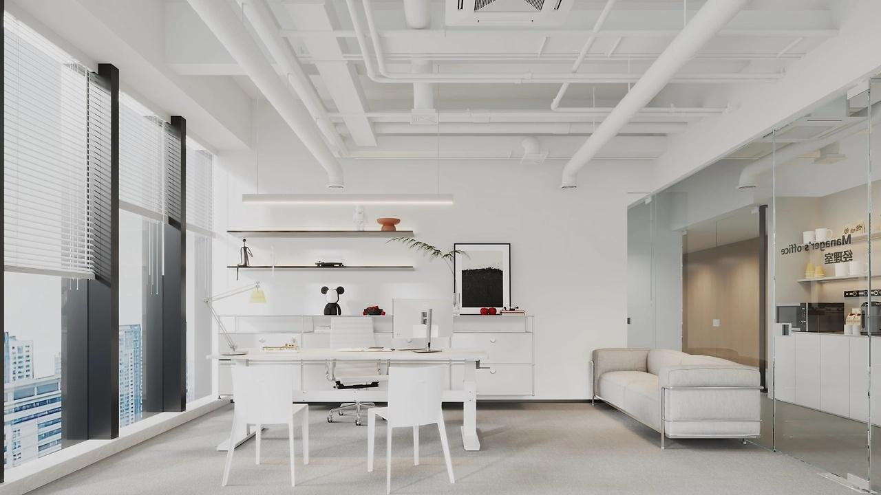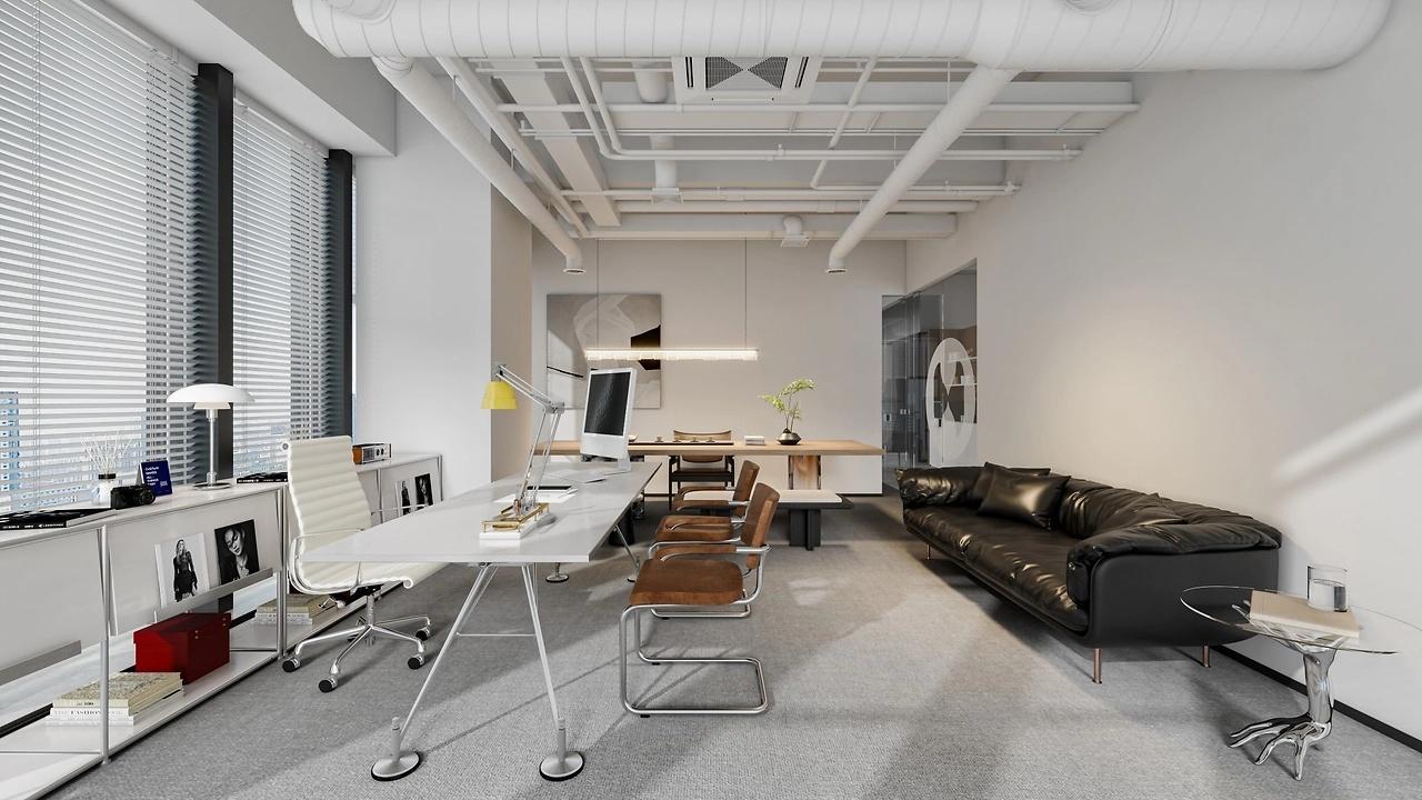 走进办公室,首先映入眼帘的是简洁流畅的线条。摒弃了繁杂的装饰,以直线、几何形状为主导,勾勒出空间的轮廓。从天花板的造型到墙面的装饰,再到办公家具的选择,都遵循着简洁的原则。这种简洁并非单调,而是在简约中蕴含着精致与品味。例如,天花板采用无主灯设计,以隐藏式灯带和筒灯组合,在满足照明需求的同时,让顶面看起来简洁大方,避免了传统吊灯带来的压抑感。