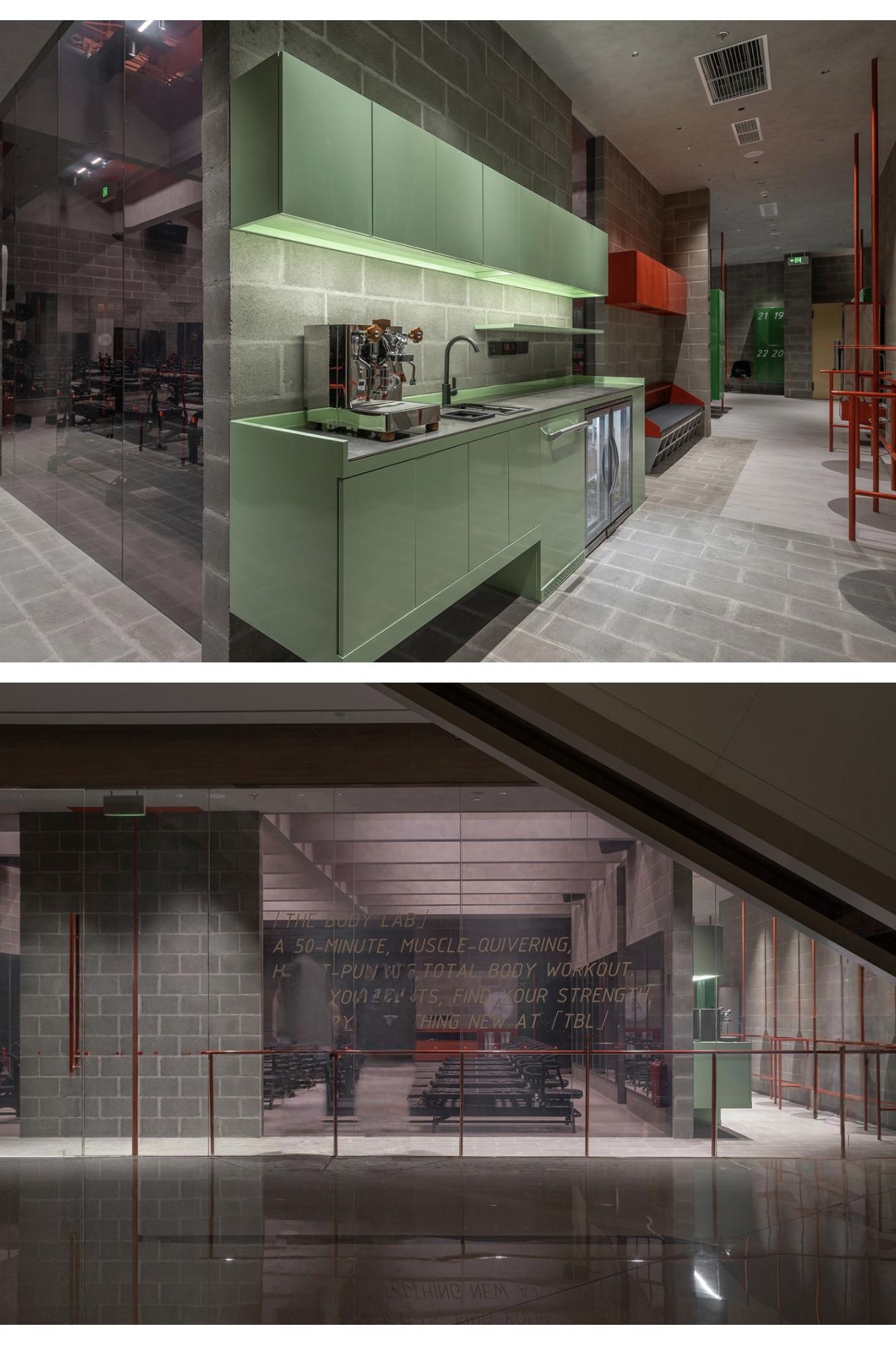 绿色的橱柜在灰色砖墙的映衬下格外亮眼,为空间注入一抹清新。这里不仅是健身的场所,更像是一个时尚的生活空间。旁边的休息区设计,满足了健身者短暂休憩、补充能量的需求。