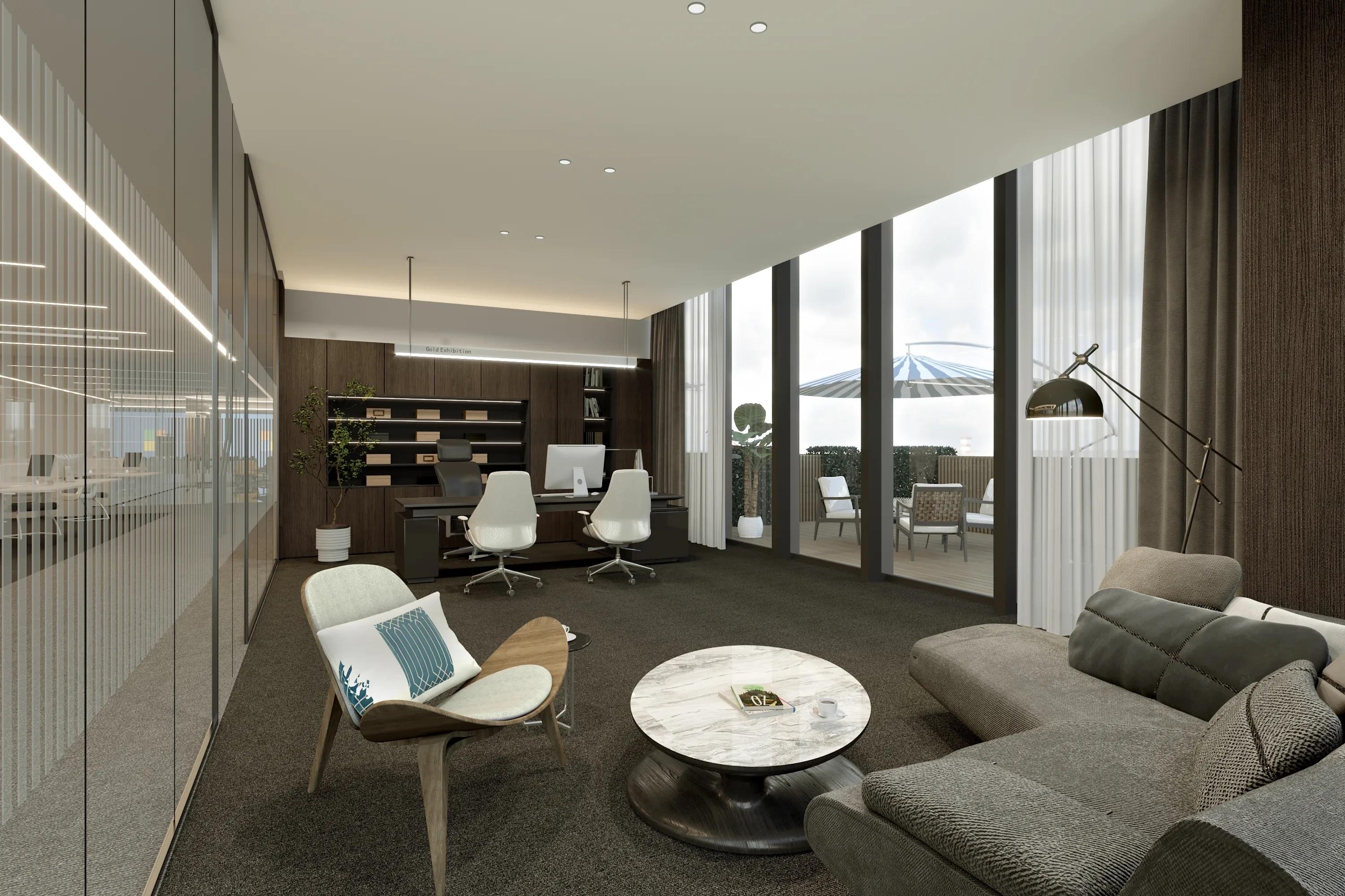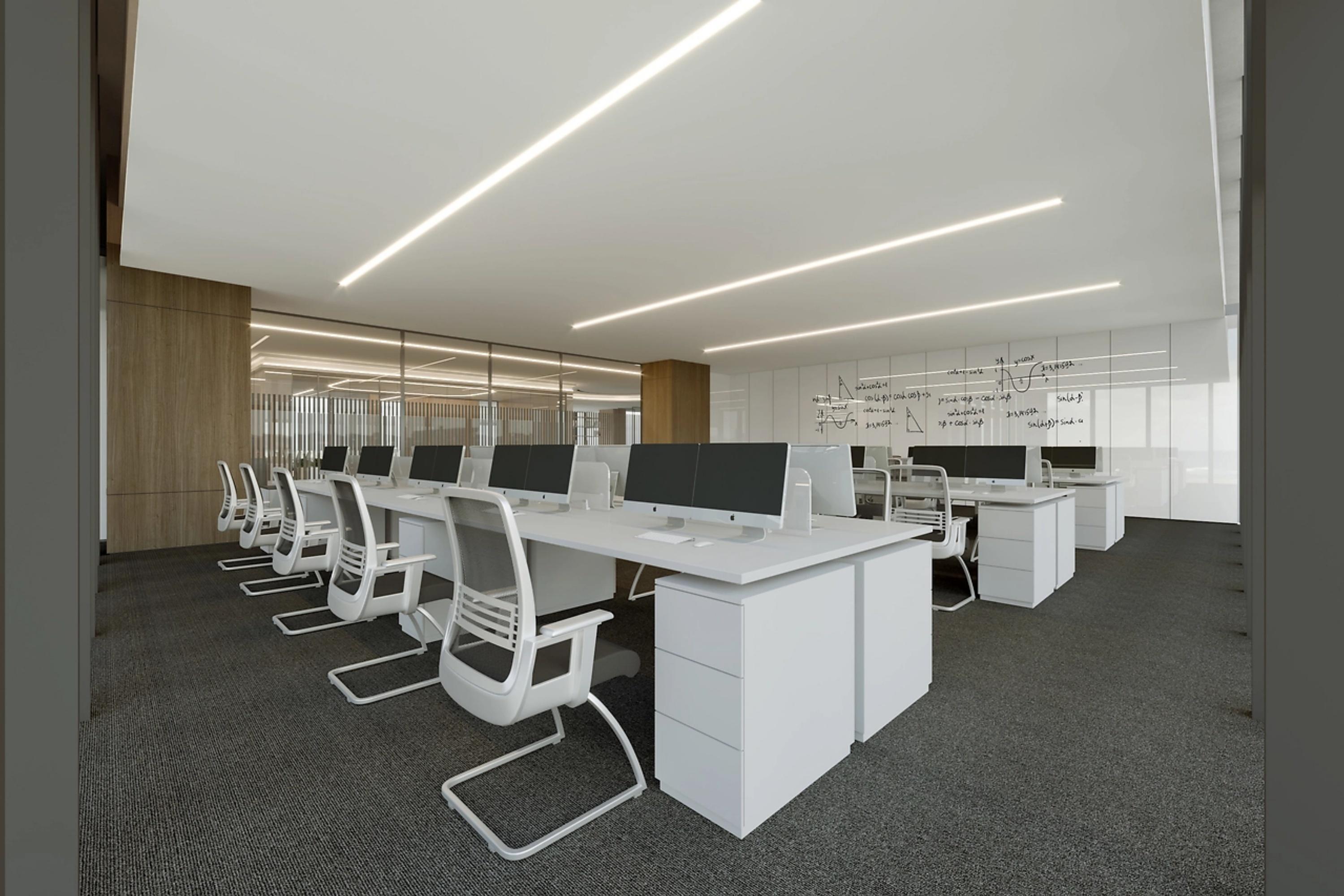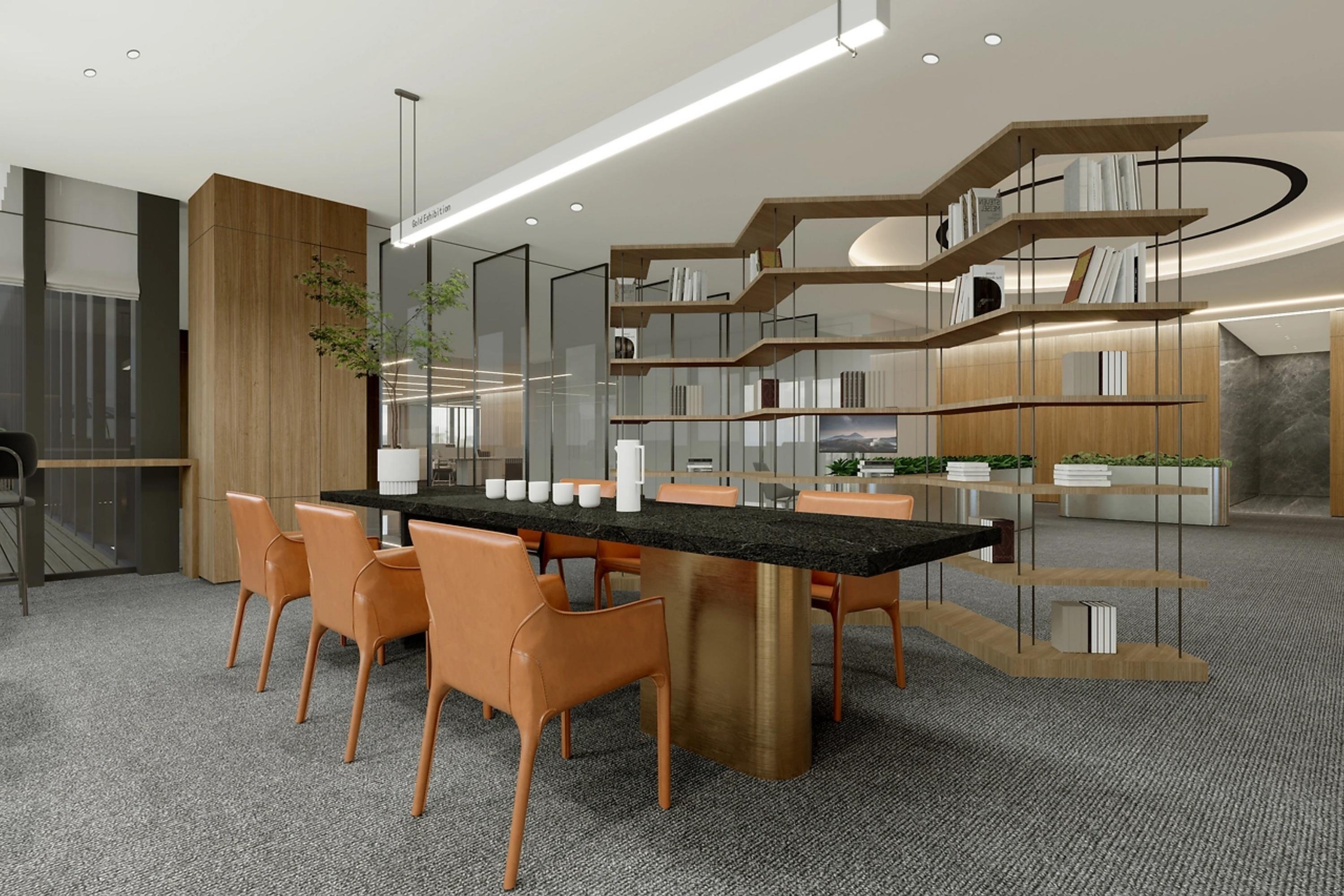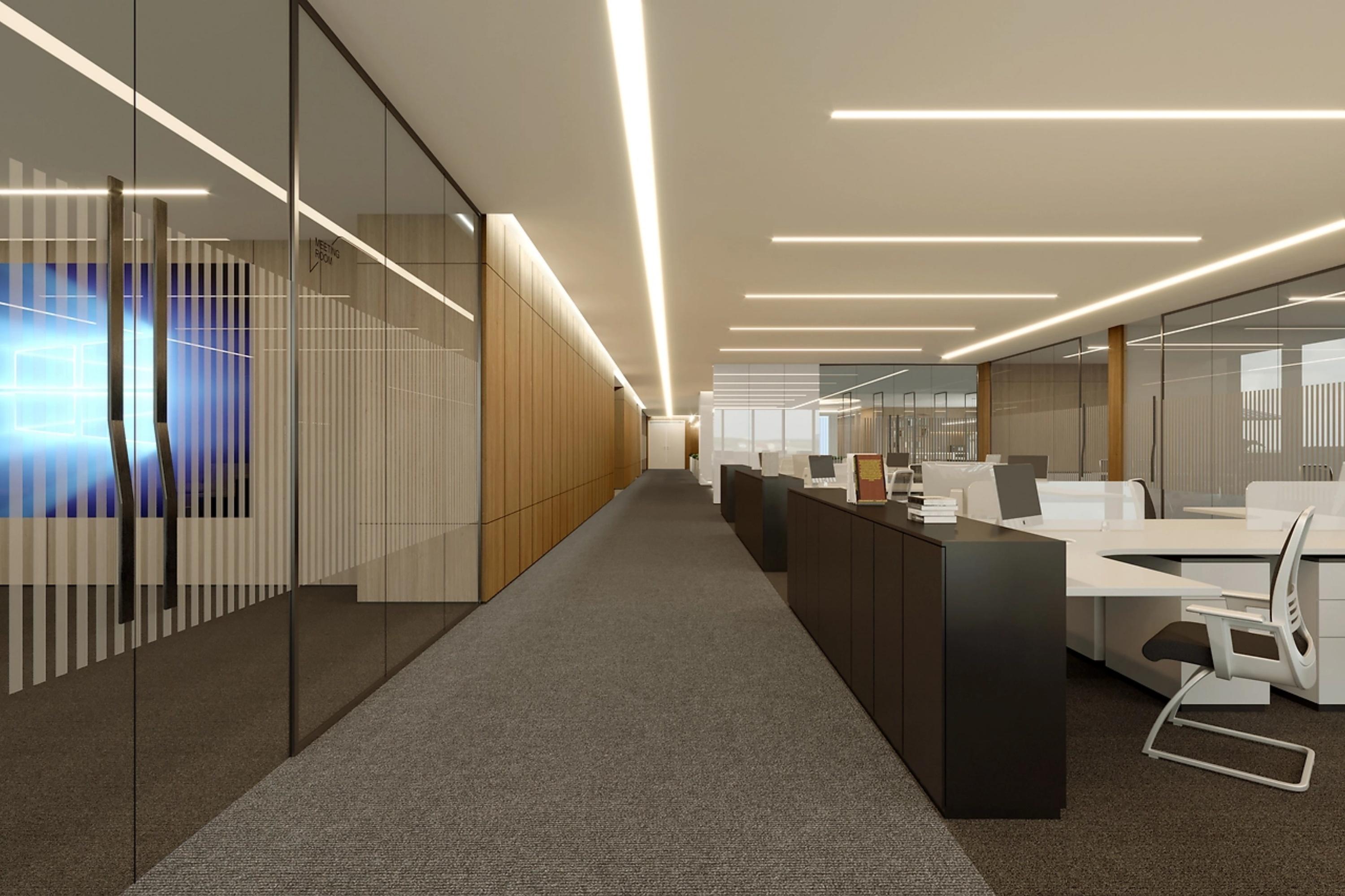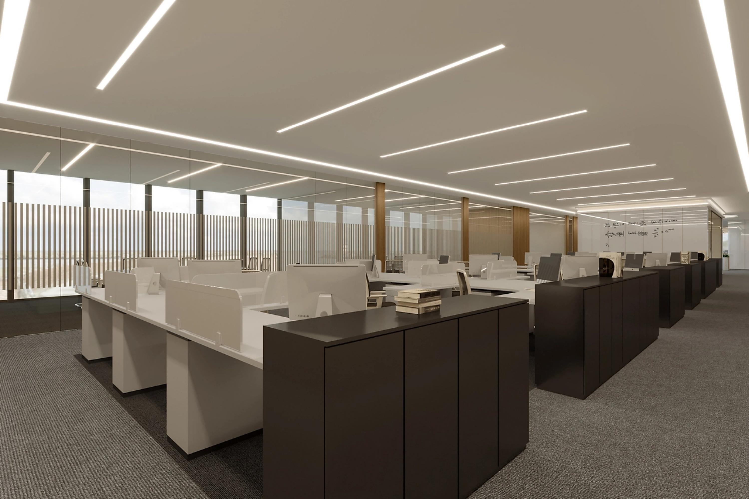 从设计风格上看,秉持简约现代风。简洁的线条勾勒出空间的利落感,摒弃繁琐装饰,以中性色调为基础,营造出沉稳而大气的氛围。自然材质如木质元素的融入,为空间增添了温暖与亲和力。玻璃隔断的大量运用,不仅极大提升了空间的通透感,让光线得以充分穿梭,还巧妙划分区域,使整个办公空间既开放又有序。线性灯光的设计更是点睛之笔,它不仅提供了充足且均匀的照明,更赋予空间时尚与科技的独特韵味,让办公环境紧跟时代潮流。