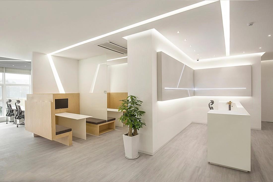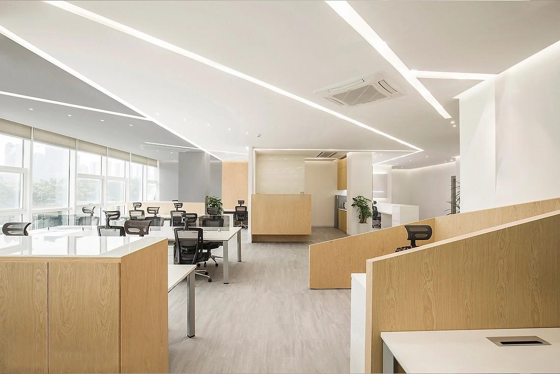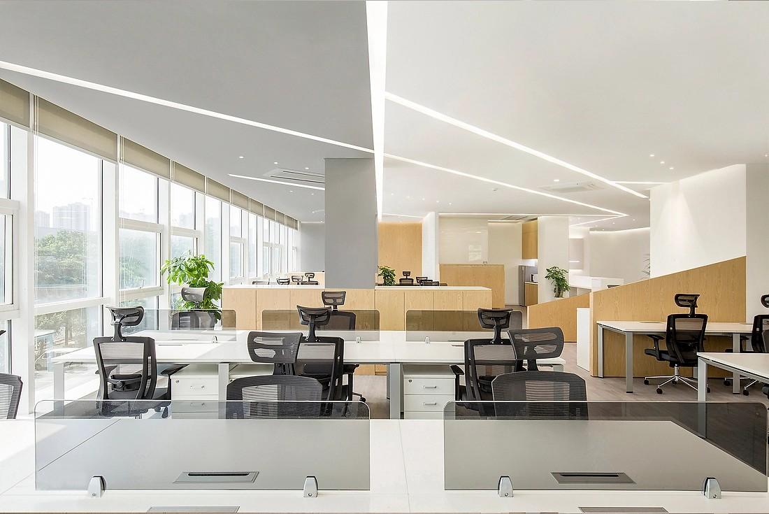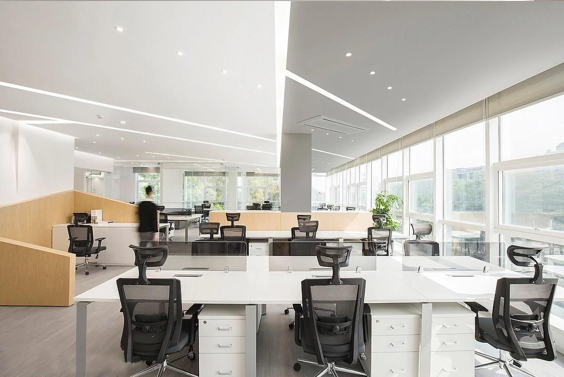 在公共办公区的天花板设计上,线条灯带再次成为点睛之笔。这些灯带沿着天花板的轮廓或按照几何图案铺设,增加了空间的层次感,使原本单调的天花板变得生动起来。同时,灯光设计充分考虑了办公照明需求,光线均匀且明亮,既不会产生刺眼的眩光,又能确保每一个工作区域都有充足的光线,为员工营造出舒适的光环境。开放式的办公布局,搭配白色的办公桌与黑色的人体工学办公椅,简洁而不失大气。办公桌的设计充分考虑了实用性,宽敞的桌面与下方的抽屉,满足了员工放置办公用品与文件资料的需求。浅木色的隔断在划分空间的同时,又保证了空间的通透感,方便员工之间的交流与协作。