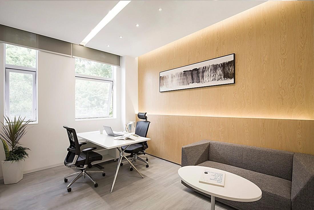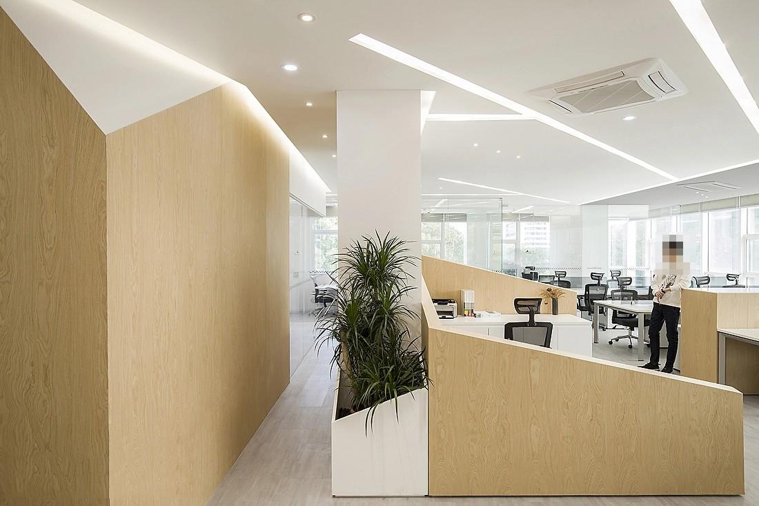 穿过接待区,便来到了公共办公区。这里是员工们日常工作的主要场所,其装修设计充分体现了成都办公室装修公司对于细节与功能的双重追求。浅木色的墙面与地板相互呼应,木材天然的纹理如同一幅幅细腻的画卷,为空间增添了自然温暖的氛围。每一道纹理都仿佛在诉说着自然的故事,让员工在繁忙的工作中也能感受到大自然的亲近。