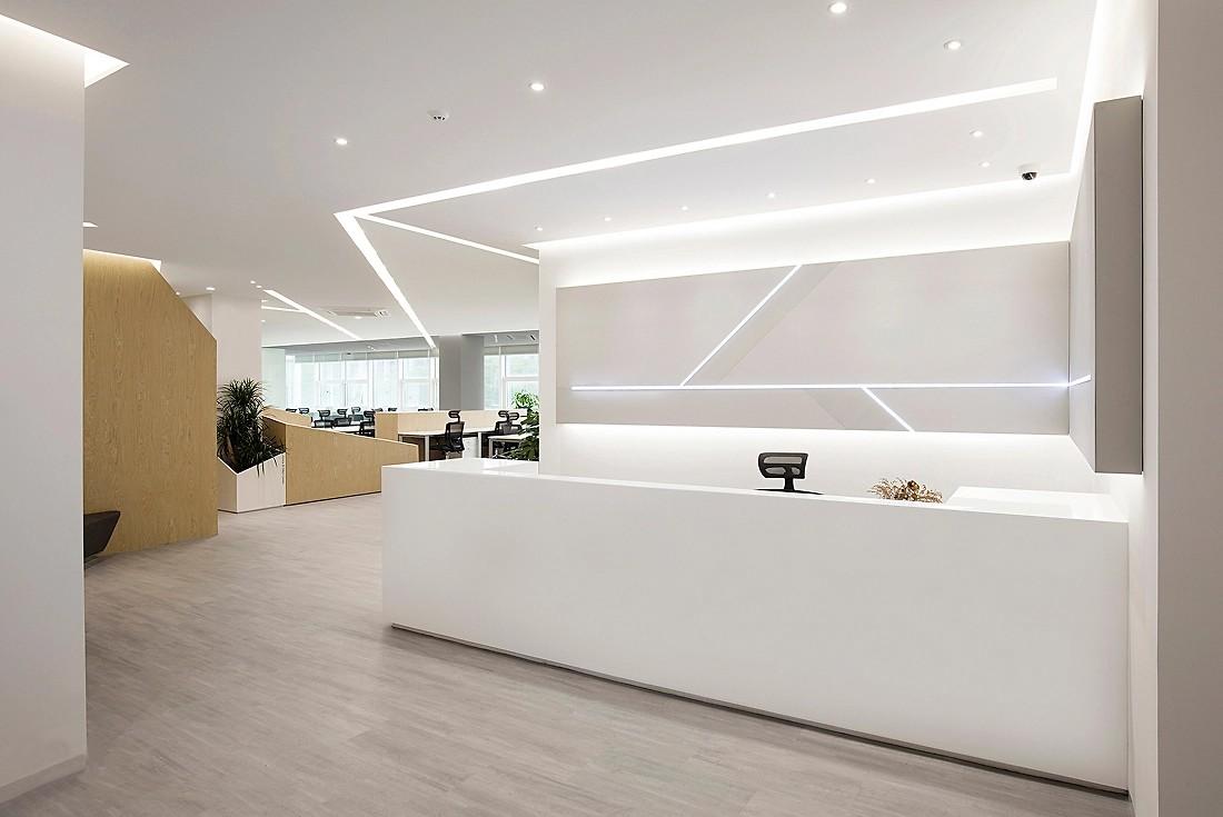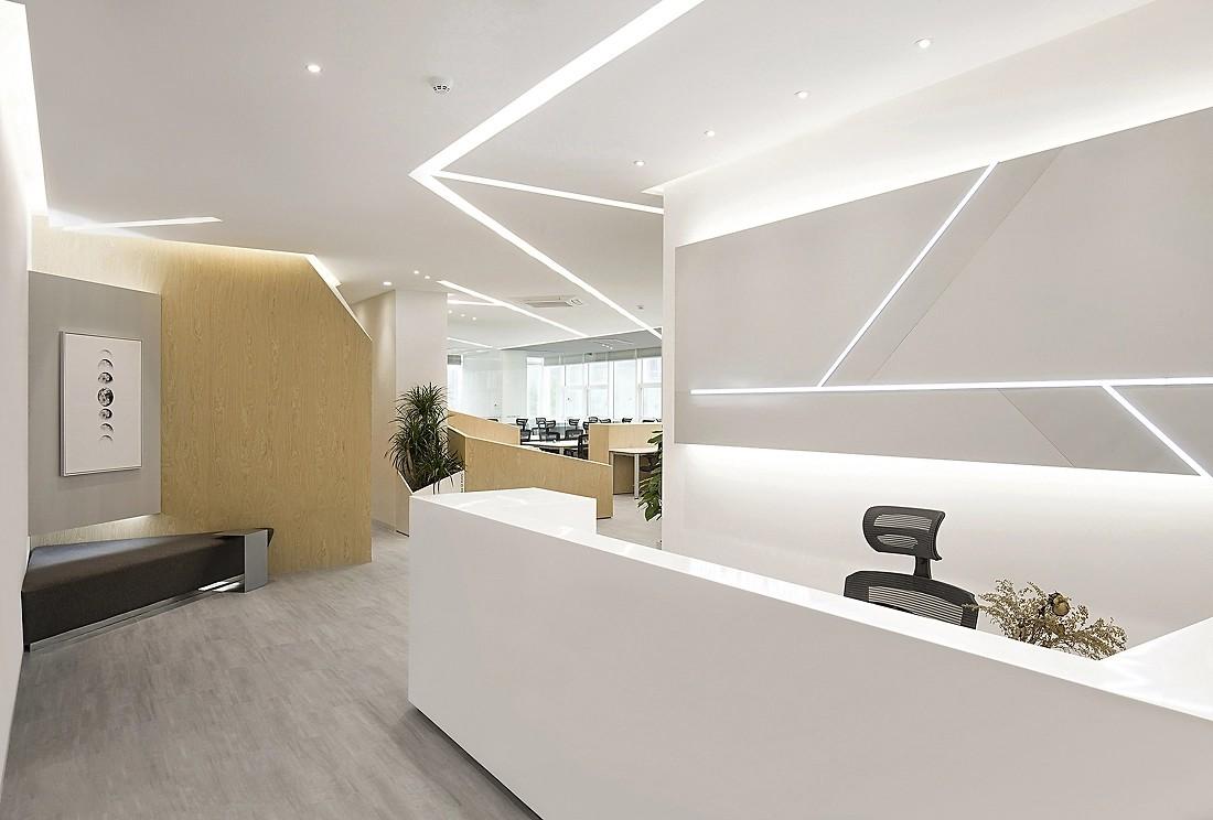 整体设计以简洁时尚为核心,大胆采用白色为主色调,巧妙搭配浅木色元素,成功营造出明亮、干净且富有质感的氛围。踏入这个办公空间,首先映入眼帘的是前台接待区。白色的接待台造型简约流畅,宛如一件现代艺术作品。接待台后方的背景墙,无疑是整个空间的视觉焦点。成都办公室装修公司运用了几何线条的灯带设计,这些灯带或横或斜,在白色的墙面上交织出独特的图案,不仅增加了空间的立体感,更赋予其强烈的现代感。天花板上均匀分布的嵌入式筒灯,提供了充足而柔和的基础照明,满足日常接待工作的需求。而背景墙的线性灯带则作为装饰性照明,在夜晚点亮时,营造出温馨且专业的氛围,让每一位到访的客人都能感受到企业的独特魅力与严谨态度。