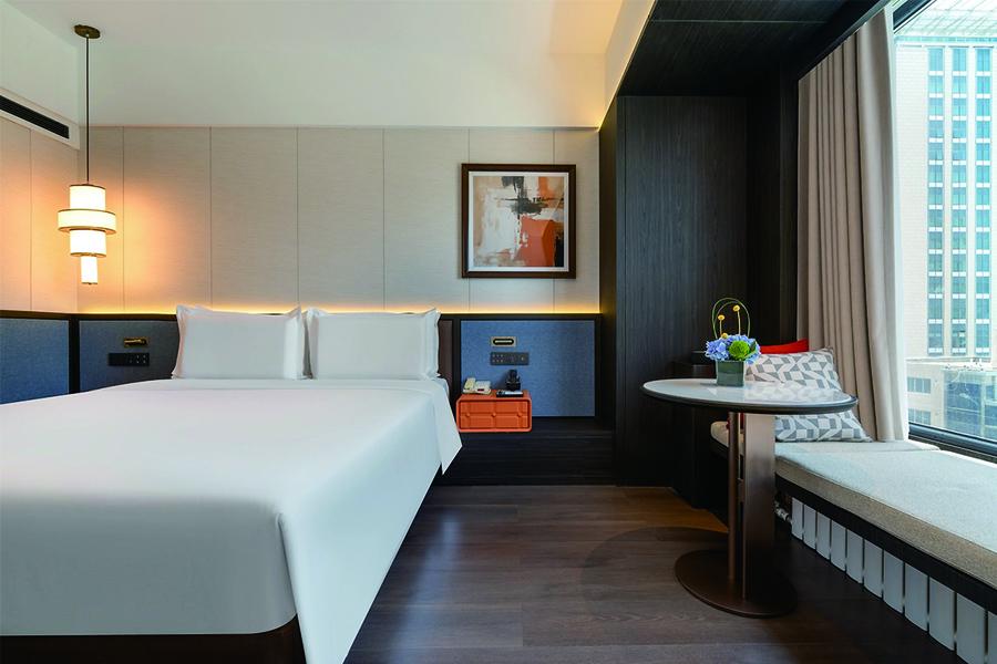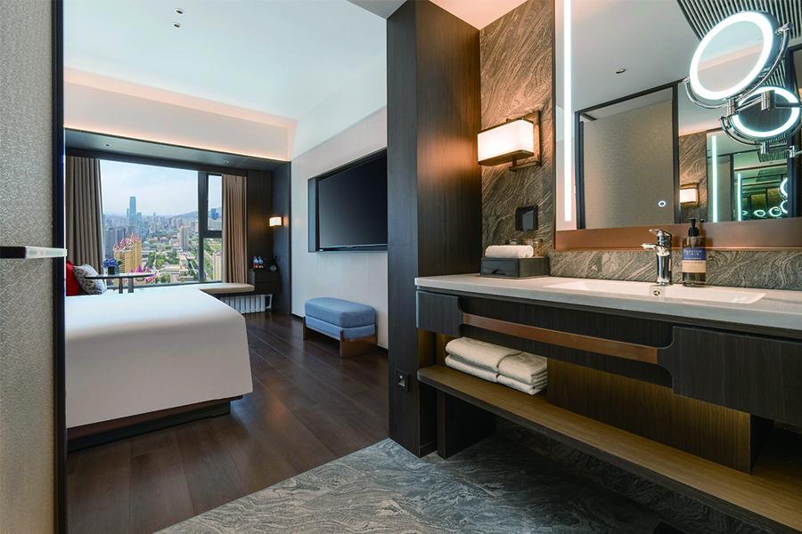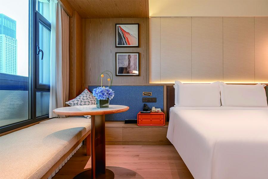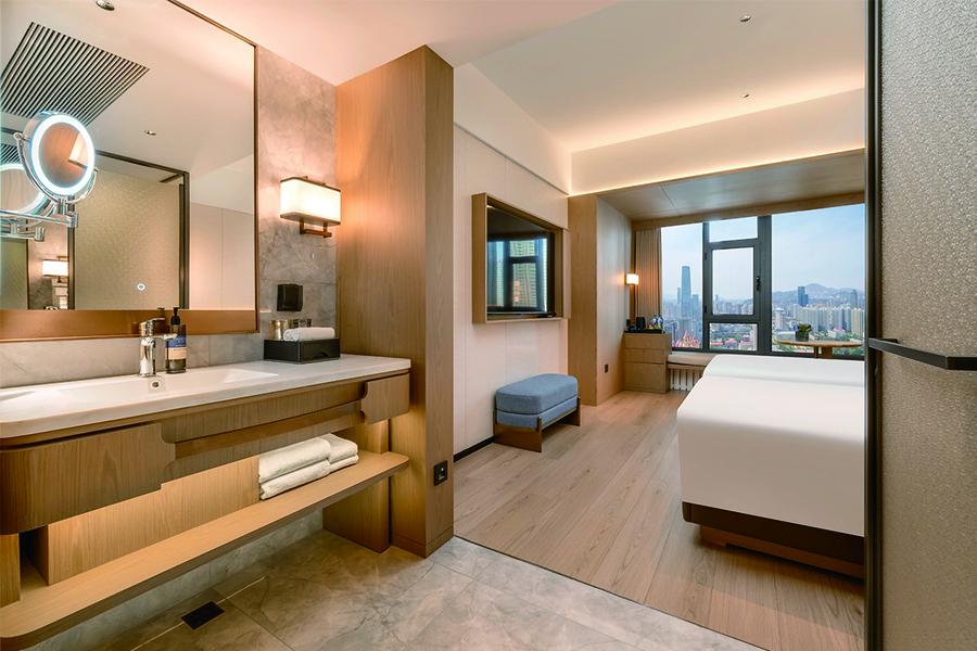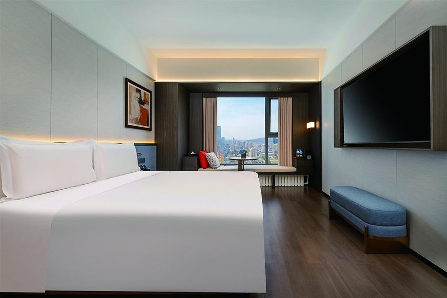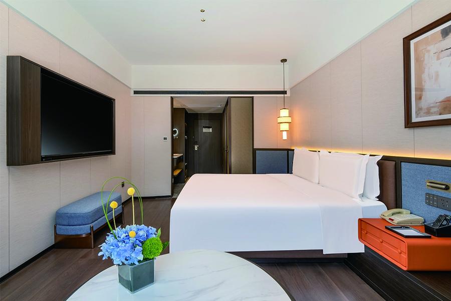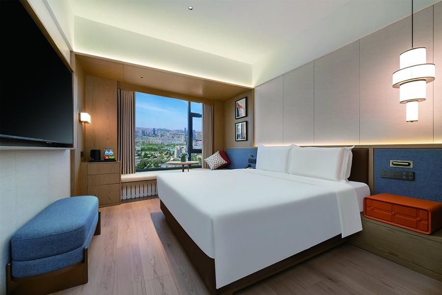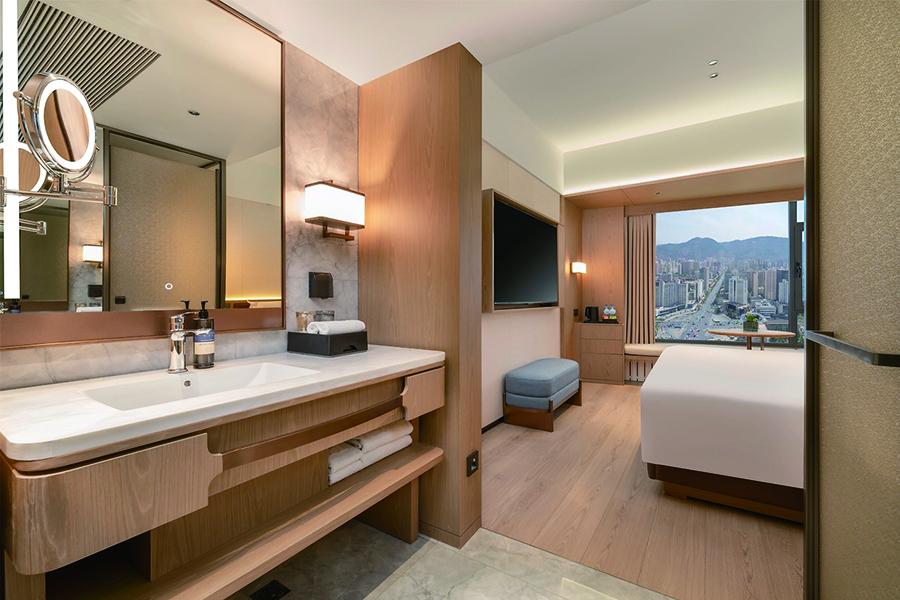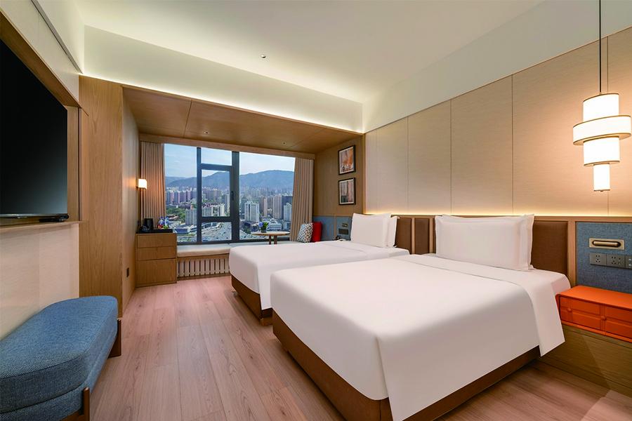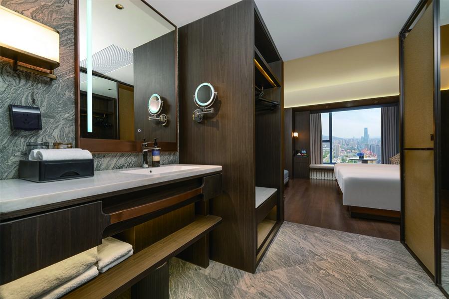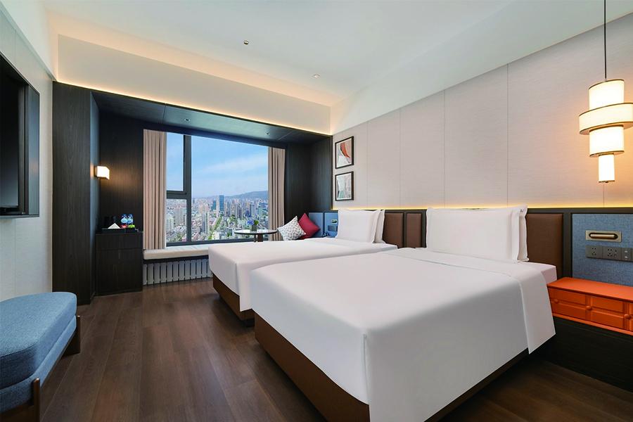 客房内的家具选择与搭配也尽显巧思。木质的地板与柜体,纹理自然,散发着质朴的气息,仿佛将广安当地的自然质感融入其中。窗边的小桌与长椅,为宾客提供了一处可静享城市风光的角落。在这里,宾客可以泡上一杯茶,透过宽大的落地窗,俯瞰广安的城市景致。白天,阳光透过窗户洒满房间,给整个空间镀上一层金色的光辉;夜晚,城市的万家灯火在窗外闪烁,又为客房增添了几分浪漫与静谧。
