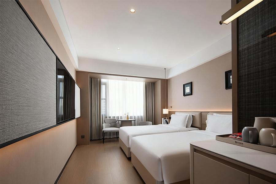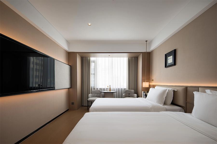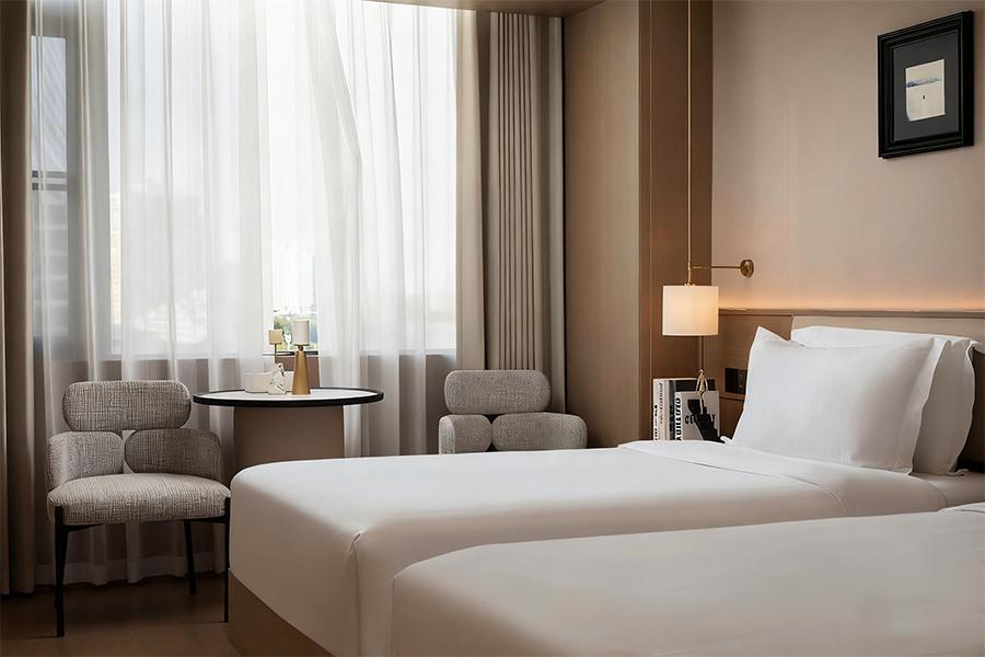 在双床客房中,设计同样出色。两张整齐排列的床铺,满足了多人出行的需求。床与床之间的距离恰到好处,既保证了各自的私密空间,又不会让整个房间显得空旷。房间内的家具摆放错落有致,无论是墙角的小桌配椅,还是墙上的装饰画,都经过精心挑选与布置,每一个角落都透露出精致感。