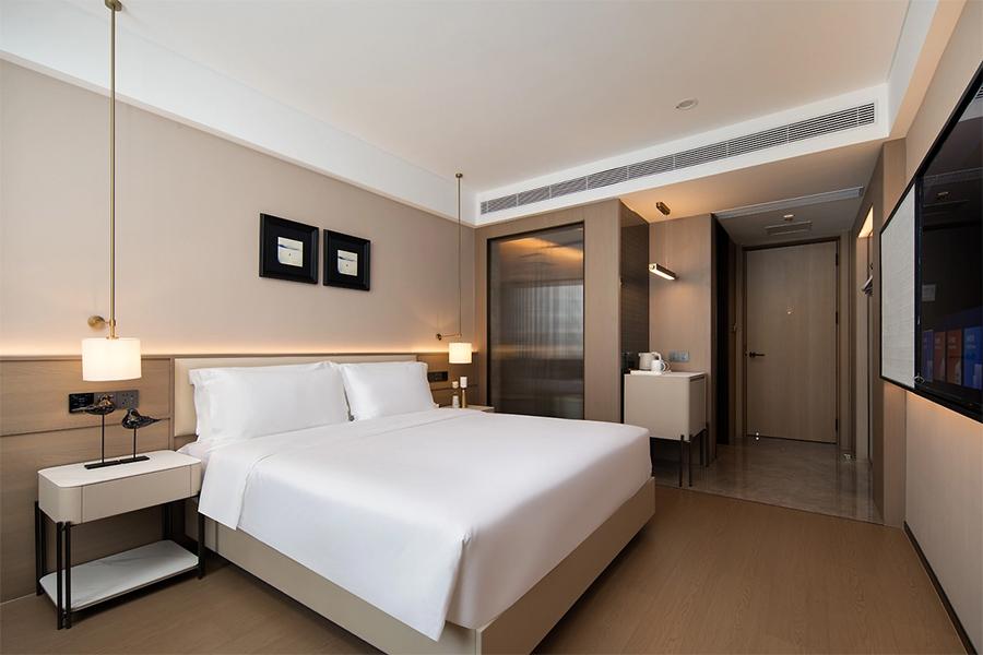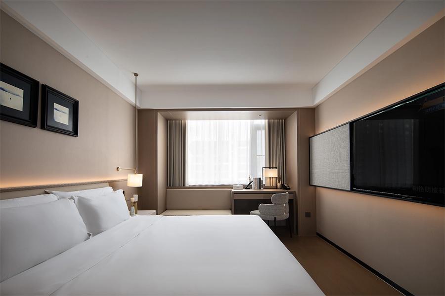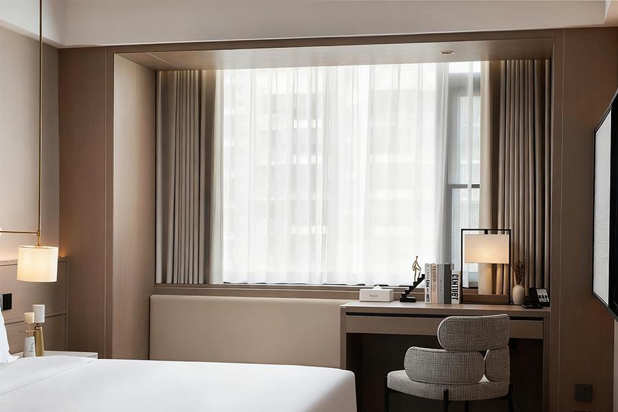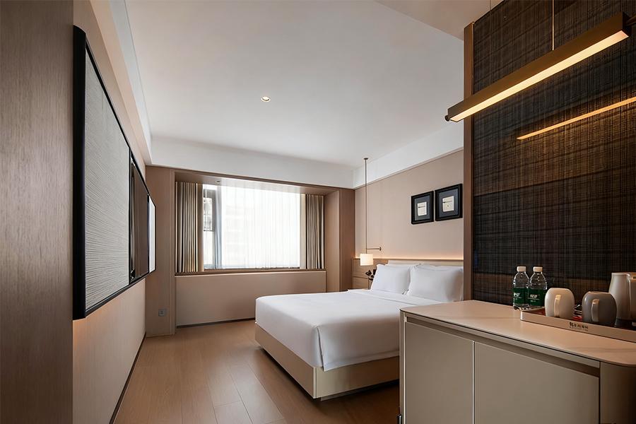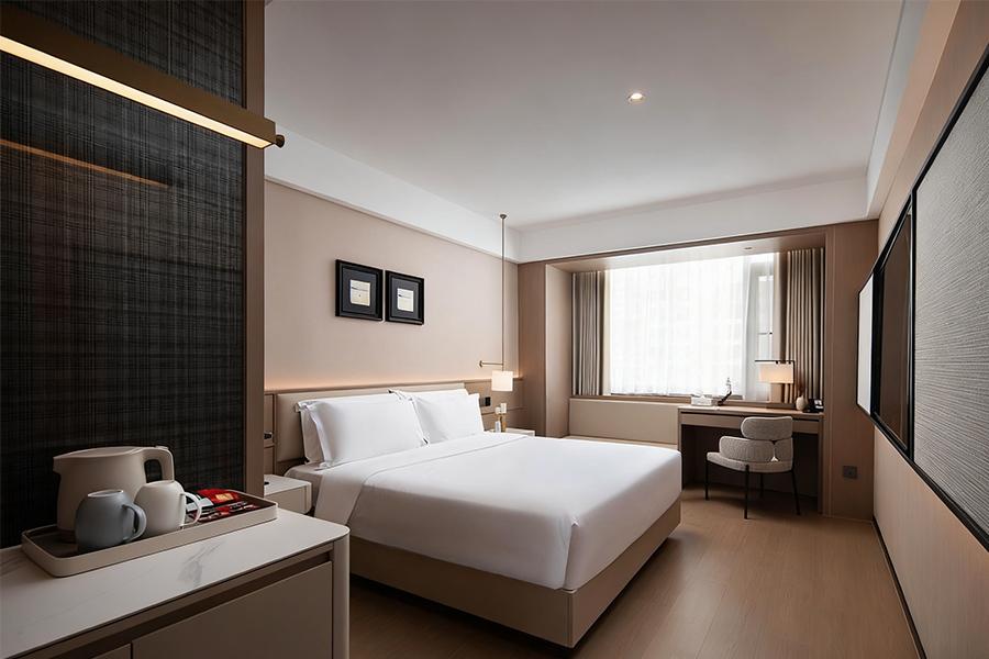 走进客房区域,更是能感受到设计的用心。房间以柔和的浅棕色为主色调,搭配上白色的床品,营造出温馨、舒适的睡眠环境。宽大的床铺,如同云朵般柔软,仿佛能将所有的疲惫都温柔抚平。床头的壁灯,光线恰到好处,既可以满足夜间阅读的需求,又不会破坏整体的静谧感。