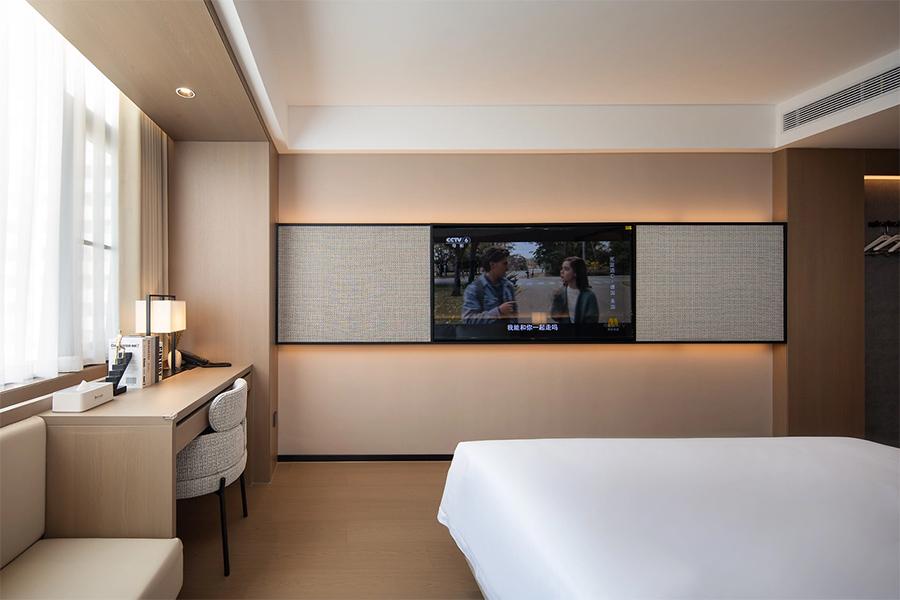客房内的布局也十分考究。靠墙设置的书桌,为商务出行的宾客提供了便利的办公空间,搭配上舒适的座椅,让工作也成为一种享受。旁边的电视墙设计独特,电视与周围的装饰板巧妙融合,既保证了视觉上的整洁美观,又不影响观影体验。当屏幕亮起,无论是欣赏一部精彩的电影,还是关注时事新闻,都能带来绝佳的视听感受。