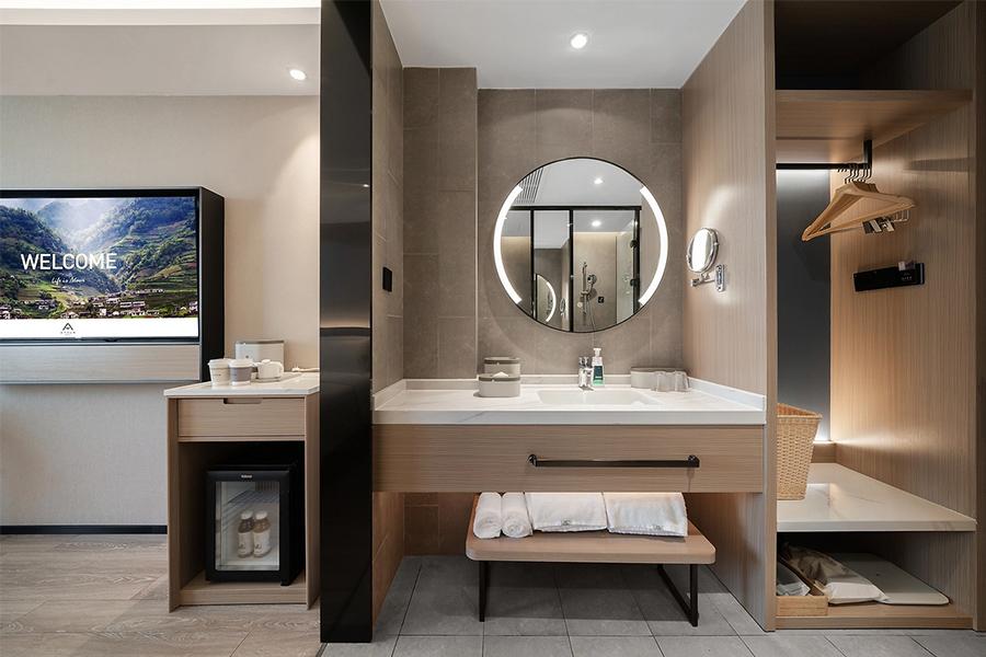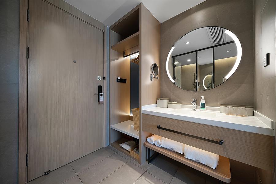 客房内的功能分区同样经过了精心考量。工作区域的书桌与座椅,为商务出行的客人提供了便捷的办公空间;休闲区域的沙发,让客人在闲暇时光可以舒适地阅读或观景。四川壹西格玛建筑工程有限公司还注重细节的打磨,客房内的每一个插座位置、每一盏灯的光线角度,都经过反复推敲,只为给客人带来最贴心、最舒适的使用体验。而卫生间的设计,更是体现了该公司对品质的严苛要求。圆形的镜子搭配环绕式的灯光,不仅方便客人整理仪容,更营造出一种温馨的氛围感。大理石材质的洗手台,质感十足,毛巾、洗漱用品等整齐地摆放着,尽显酒店的用心与专业。