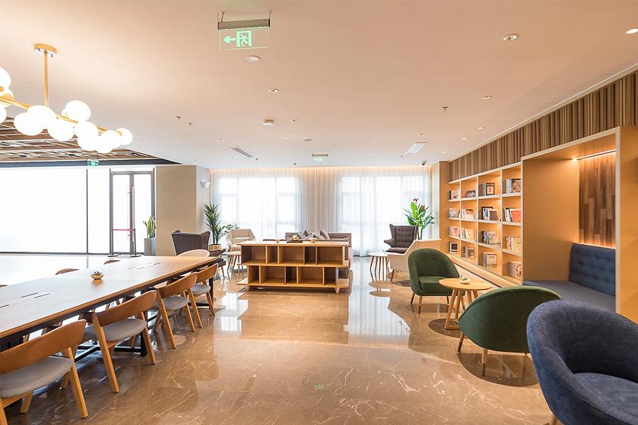 走进眉山市由四川壹西格玛建筑工程有限公司操刀设计的酒店公共区域,首先映入眼帘的是一处融合了社交与休憩功能的共享空间。暖色调的灯光如轻柔的纱幔,笼罩着整个区域,消解了空间的清冷感。造型别致的吊灯,如星辰般点缀在天花板上,洒下柔和光晕。浅木色的长桌与同色系书架相得益彰,书架上错落摆放的书籍与装饰摆件,为空间增添了几分文艺气息。在这里,宾客可与友人围坐畅谈,也能独自静享阅读时光,四川壹西格玛建筑工程有限公司巧妙地利用空间布局,让公共区域不再是单纯的过渡地带,而成为了一处能引发情感共鸣、促进交流的温馨场域。