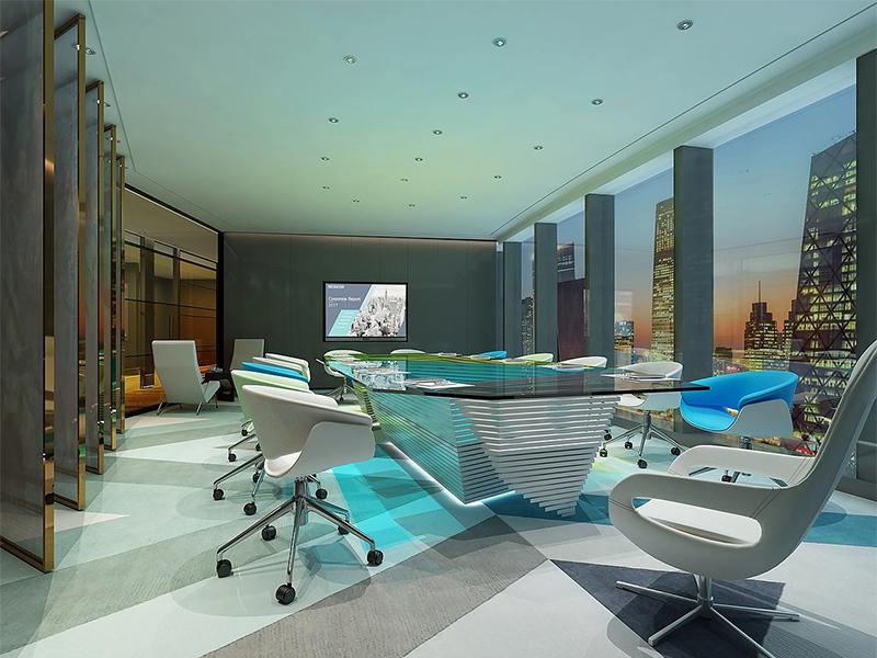 第三张图开放式办公区是协作“活力引擎”,借960平开阔空间营造通透氛围。蓝黄亮色座椅打破单调,全景落地窗引入高新区天际线与自然光,缓解视觉疲劳。天花板几何折面配嵌入式灯带,增强层次与艺术感,为团队协作提供轻松环境,激发创意碰撞。