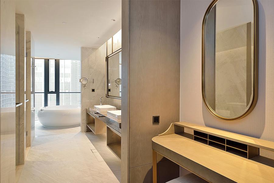 酒店的卫浴空间,同样是设计与功能完美融合的典范。大理石材质的运用,让整个空间显得奢华而高雅。独立的浴缸区域,为住客提供了一个可以尽情享受泡澡乐趣的私密空间,洗去一身的疲惫。洗手台的设计简洁大方,镜面与灯光的搭配,不仅方便了住客的日常整理,更增强了空间的明亮感与时尚感。四川壹西格玛建筑工程有限公司在卫浴空间的施工中,对防水、防滑等关键环节严格把关,以专业的技术确保空间的使用安全与耐久,让住客在洗漱沐浴时,也能感受到高品质的空间体验。