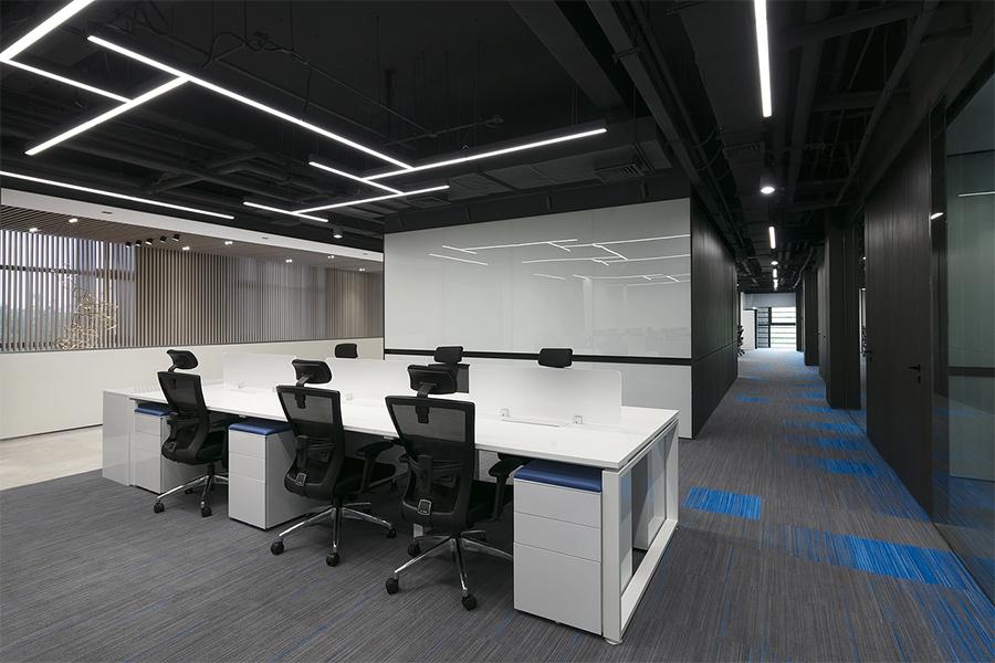 而在一些细节之处,更能体现四川壹西格玛的匠心独运。玻璃隔断的使用,让空间在视觉上更加通透开阔,同时也保证了各个功能区域的相对独立。隔断上精心布置的绿植,如同一串串绿色的风铃,为冷峻的玻璃增添了生机与灵动。地面的地毯,采用了带有蓝色线条的设计,既起到了吸音降噪的作用,又为空间注入了一抹清新的色彩,与整体的黑白灰主色调形成鲜明对比,让空间不至于陷入单调。