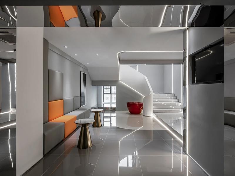 走进酒店公共区域,首先映入眼帘的是线条流畅的白色楼梯,宛如一件精美的艺术装置。简洁的灯光设计巧妙地勾勒出楼梯的轮廓,与光滑瓷砖铺就的地面相互映衬,营造出明亮且富有层次感的空间。色彩鲜明的红色装饰椅,如同一抹热烈的火焰,为空间增添了活力;带有橙色元素的座椅,又带来温暖的视觉感受,整体公共区域时尚、前卫的氛围扑面而来,尽显工装设计在空间氛围营造上的巧思。 移步至卧室,酒店装修设计案例的工装设计再次展现出独特魅力。