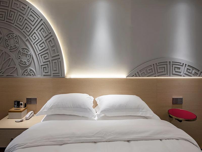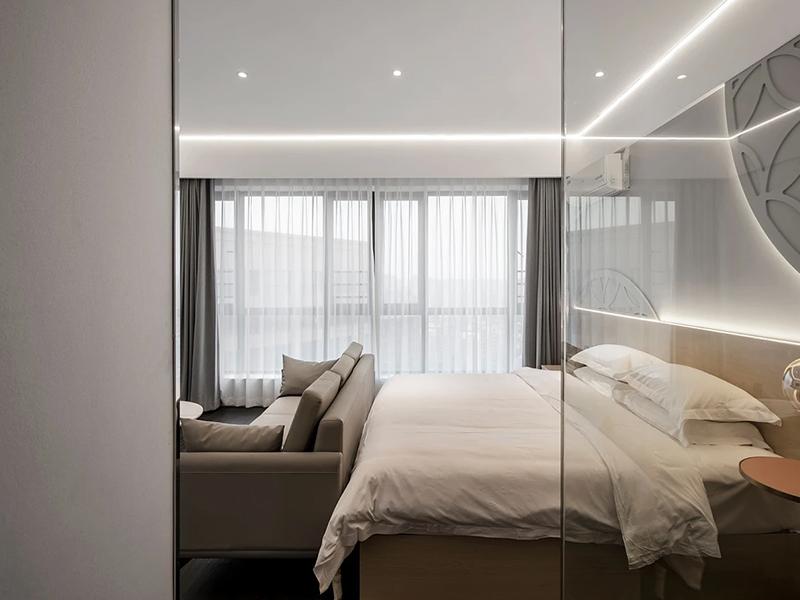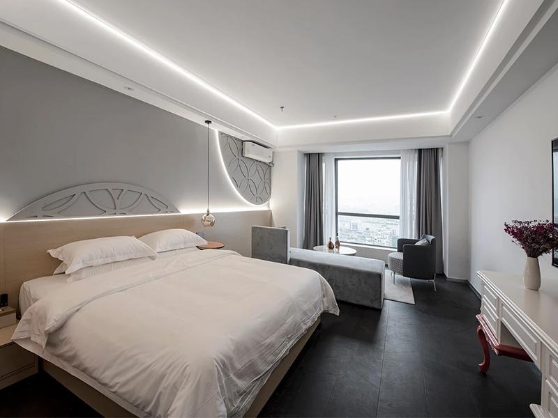 洁白整洁的床品,给人以干净、舒适的第一印象。床头带有中式回纹等元素的装饰,是工装设计对传统美学的巧妙融入,在现代简约的整体风格中,增添了一份文化底蕴与雅致韵味。房间采光极为良好,大窗户搭配轻薄的窗帘,让充足的自然光线肆意涌入,使整个空间明亮通透。同时,房间内配备的沙发、桌椅等家具,既满足了宾客休憩、工作等多种需求,又与整体装修风格和谐统一,充分体现出工装设计兼具舒适与实用的特点,让每一位入住的宾客都能感受到这份简约大气且富有格调的居住体验。