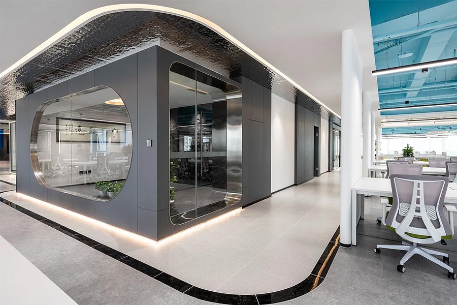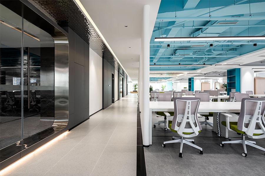 在空间的过渡与衔接处,设计同样别具匠心。走廊区域,地面采用带有黑色线条装饰的灰色地砖,与周围空间的地面材质形成呼应又有变化。墙面的处理简洁大方,局部的灯光设计为走廊增添了温馨的氛围,让员工在空间中的移动也能成为一种愉悦的体验。