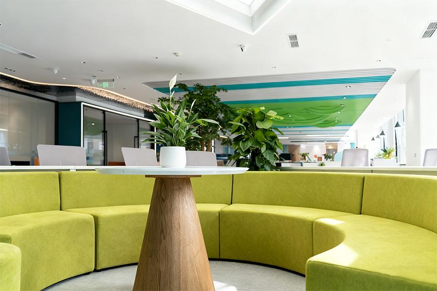 与开放办公区相邻的是协作交流空间。这里的设计充满了灵动性,绿色的弧形沙发组合成半包围的形态,中间搭配圆形小桌,形成一个个相对独立又便于交流的小区域。这种布局非常适合团队进行头脑风暴或小型讨论,轻松的氛围有助于创意的迸发。顶部独特的三角形天窗设计,不仅为空间引入更多自然光线,更成为了空间中的视觉焦点,增添了设计的趣味性与艺术感,让交流的过程也能伴随着对美的享受。