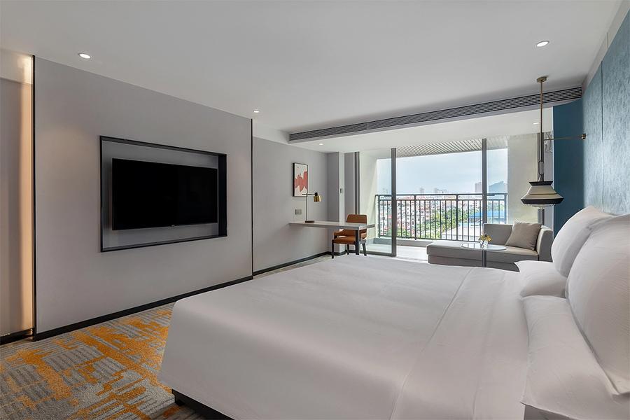 采光设计更是客房的一大亮点。大面积的落地窗或阳台门,让自然光线毫无保留地涌入室内,照亮每一个角落。阳光透过轻薄的窗帘,洒在地面的地毯上,地毯上的图案或抽象或具像,与光线交织出梦幻的光影效果,为客房增添了几分灵动与活力。在这样的空间里,清晨被阳光温柔唤醒,傍晚伴着余晖静享时光,皆是无比美好的体验。
