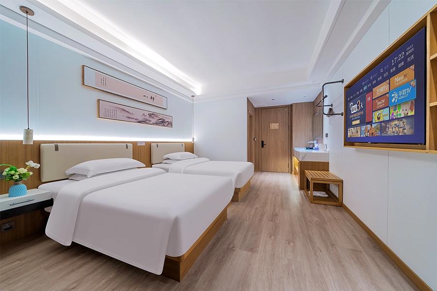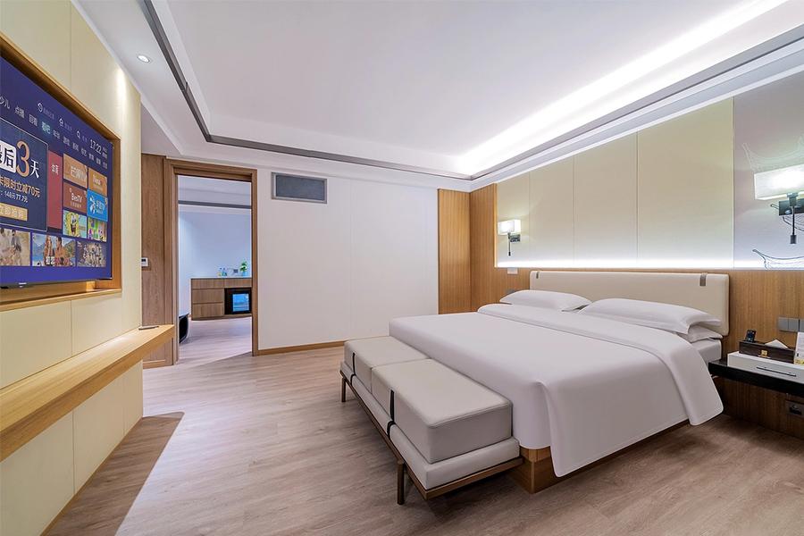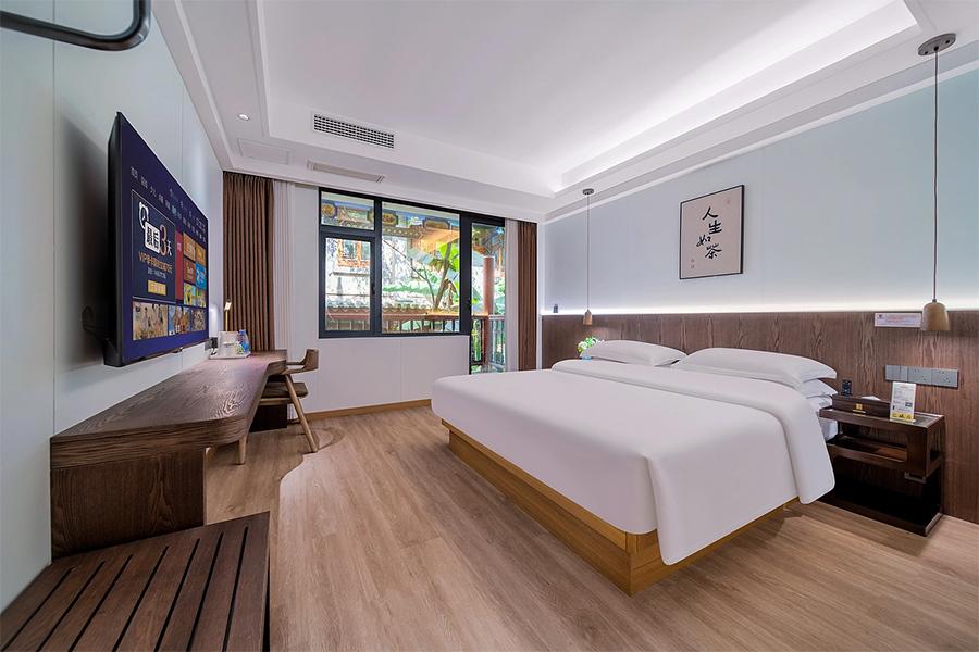 部分客房还设有观景区域,一扇大窗将室外的景色引入室内,若是窗外恰逢绿意盎然的景致,或是能瞥见城市的独特风貌,都能让住客在客房内就能与自然或城市风光来一场不期而遇的邂逅。客房内的电视背景墙设计也颇为用心,与整体的木质元素相呼应,同时又融入了现代科技感,让住客在享受自然舒适的居住环境时,也能便捷地获取各类信息与娱乐内容。